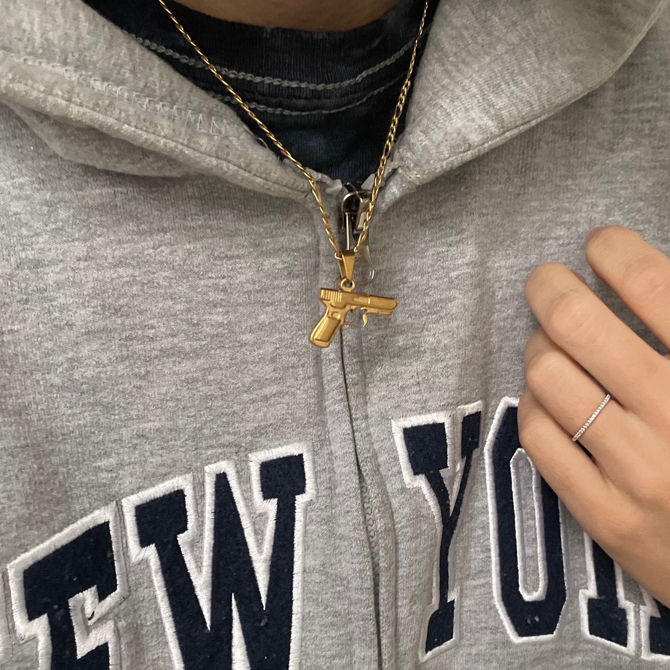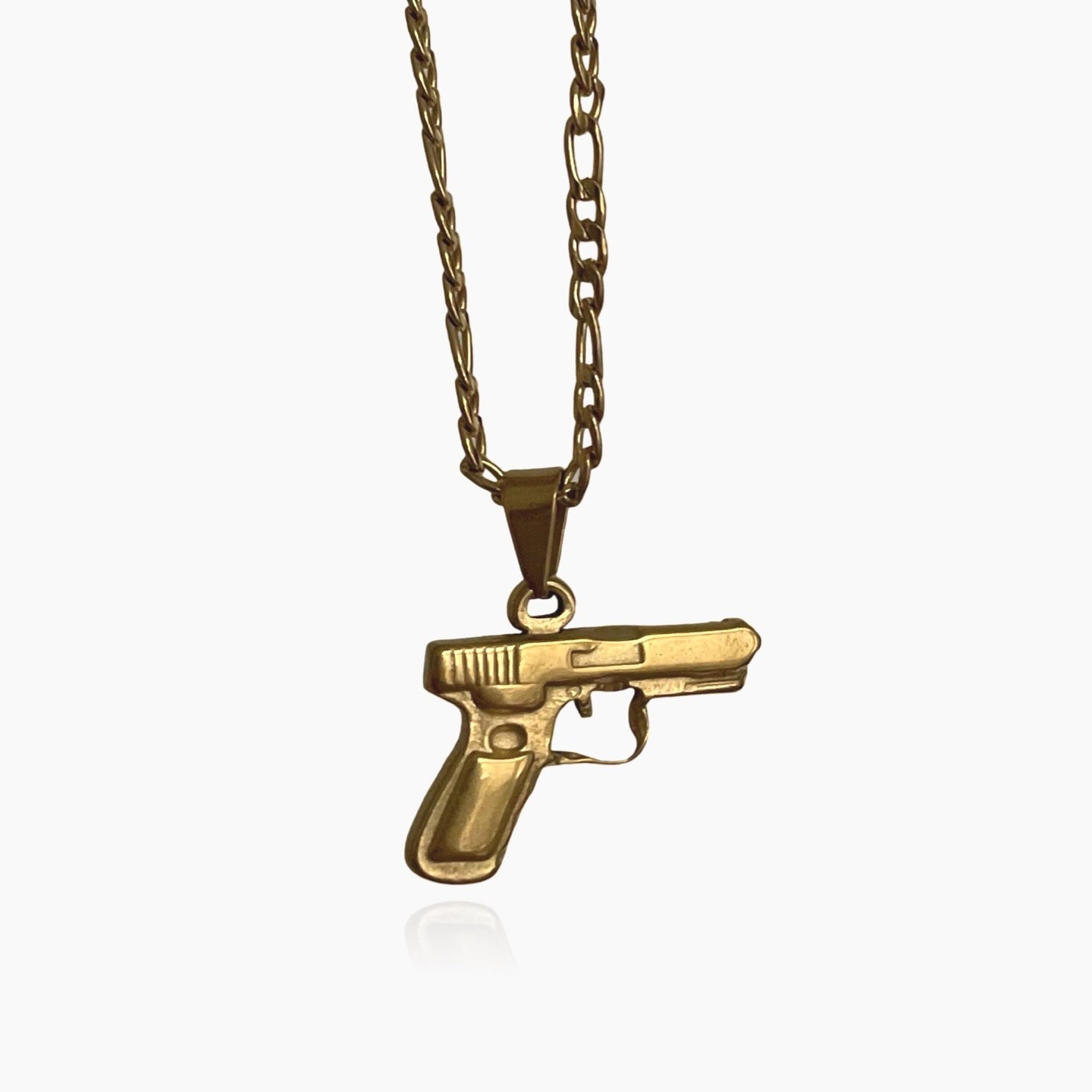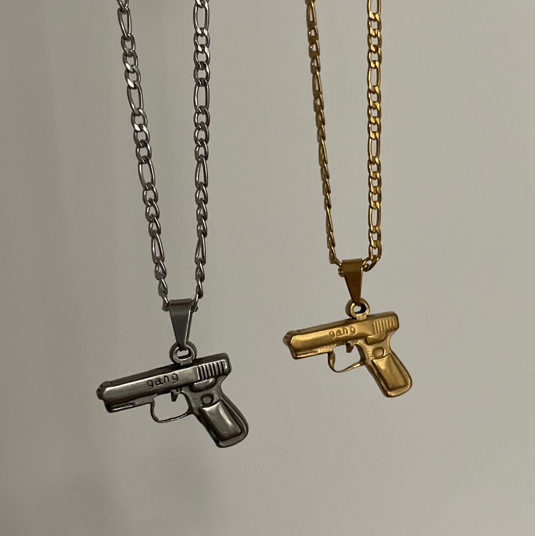 Unsere wasserdichte Unisex-Halskette mit Pistolenmotiv passt perfekt über Ihren Hals und erinnert Sie immer an das Gangsterleben. Sie verfügt über eine einzigartige Figarokette und ist in Gold und Silber erhältlich. Diese 40 + 6 cm lange Halskette mit Anhänger eignet sich hervorragend zum Tragen in mehreren Lagen und sieht wunderschön aus, wenn Sie sie mit beliebigen Ketten kombinieren. Und das Beste daran? Sie ist 100 % wasserdicht, da sie aus 18 Karat vergoldetem/versilbertem Edelstahl besteht.