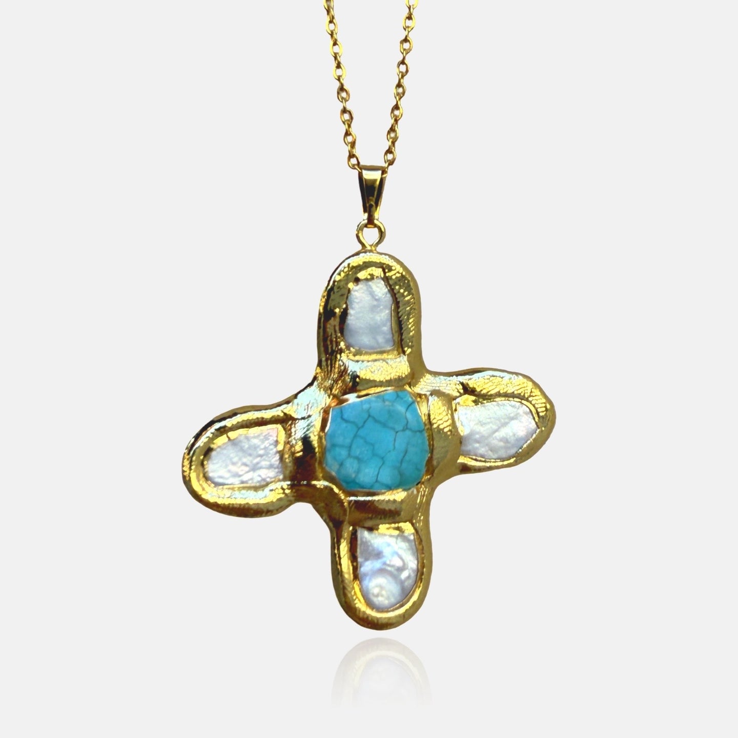 Unsere elegante, handgefertigte Naturperlenkette mit echtem Türkis verleiht Ihrem Look eine handwerkliche Note. Diese Kreuzkette mit geschmolzenem Effekt und abstrakter Perlenfassung besteht aus echten Süßwasserperlen und ist ein geschmackvolles Geschenk für einen besonderen Menschen. Sie ist ein wahres Kunstwerk.