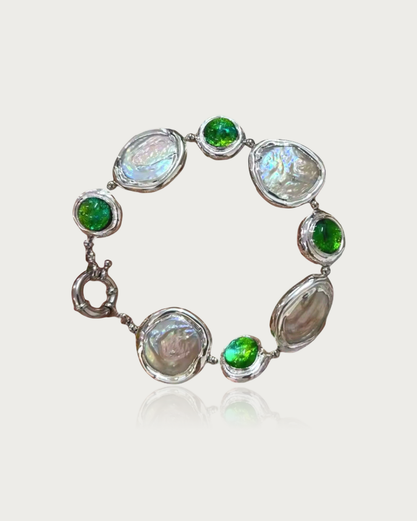 Unser elegantes, handgefertigtes Naturperlenarmband verleiht Ihrem Look eine handwerkliche Note. Dieses Armband mit geschmolzenem Effekt und abstrakter Perlenfassung besteht aus echten Süßwasserperlen und ist ein geschmackvolles Geschenk für einen besonderen Menschen. Es ist mit grünen Edelsteinen in flüssiger Silberbeschichtung versehen.