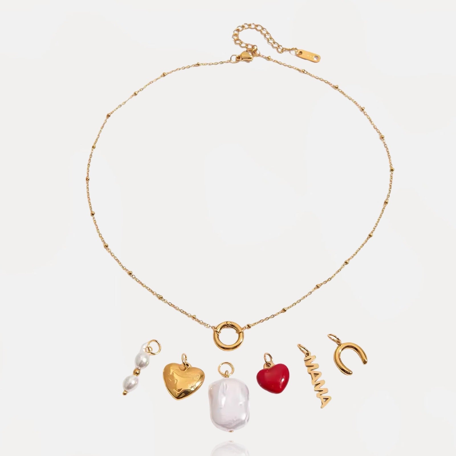 Die schönste Halskette dieses Sommers ist da! Unsere handgefertigte, zarte Sommer-Charm-Halskette strahlt positive Stimmung und Freude aus. Sie verfügt über einen Verschluss mit sechs austauschbaren Charms : Herzen, Perlen, Mama und Hufeisen. Kombinieren Sie die Charms nach Belieben. Die DIY-Halskette ist absolut wasserdicht und Ist aus hochwertigem Edelstahl.
