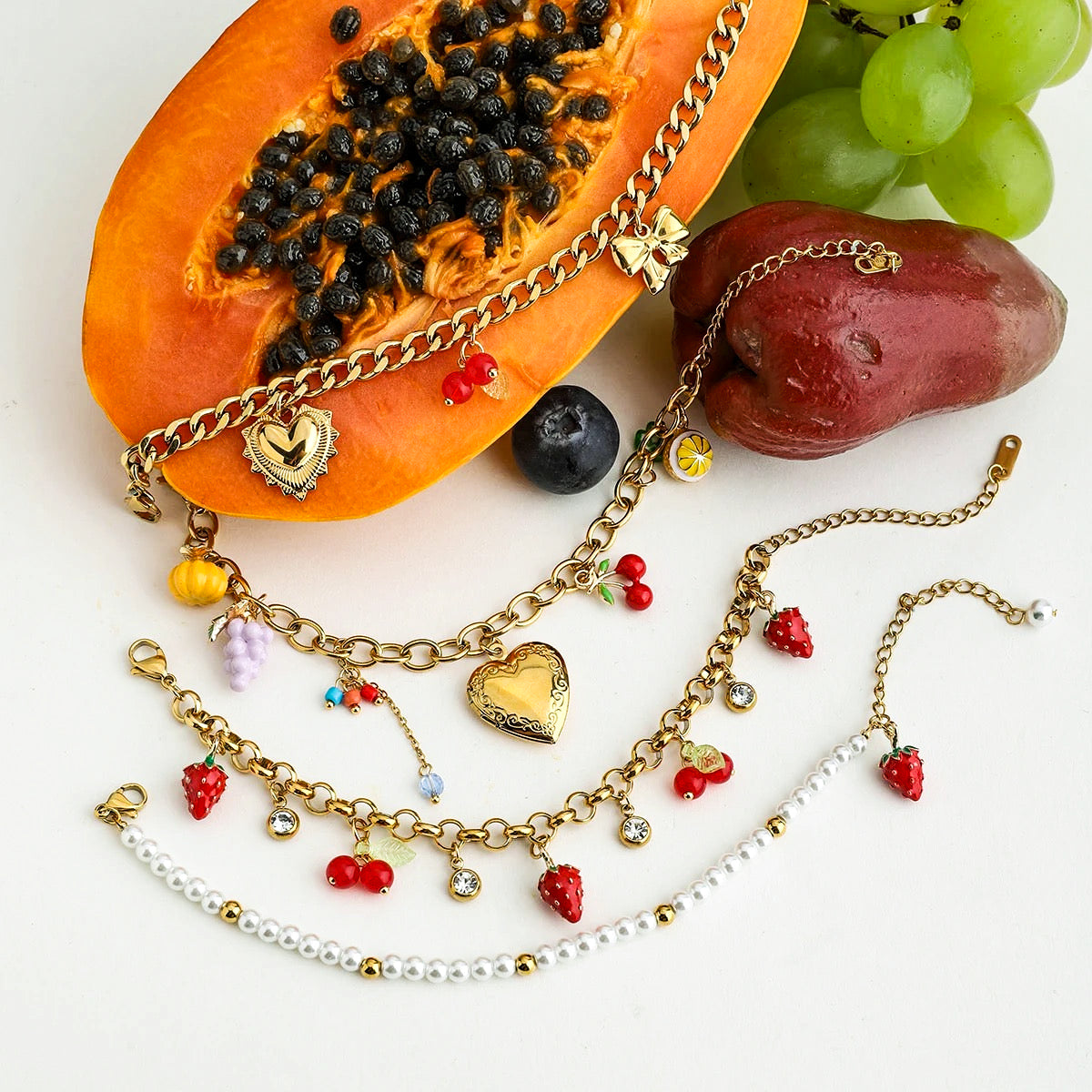 Unser elegantes, 100 % wasserdichtes, zierliches Armband mit Fruchtanhängern schmiegt sich perfekt an Ihr Handgelenk und sorgt für einen wunderschönen Look. Es besteht aus hochwertigem Edelstahl mit 18 Karat Gold oder Silber und ist mit wunderschönen Zirkonkristallen verziert.
