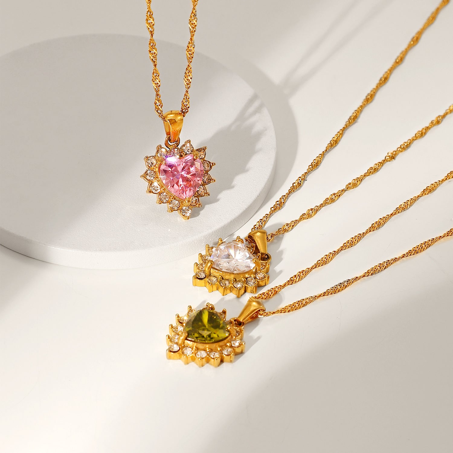 Our elegant and precious crystal heart necklace is made out of desire to embody the love and affection. It features a natural zircon stone and is adorned with small rhinestones. It will lie elegantly across your neckline to create the cutest of looks. Great for layering, this 40 cm heart pendant necklace comes in 3 color options: Pink, Green and White. It makes a perfect gift for someone special. And the best part? It's 100% waterproof, as it is made of 18K gold plated stainless steel.