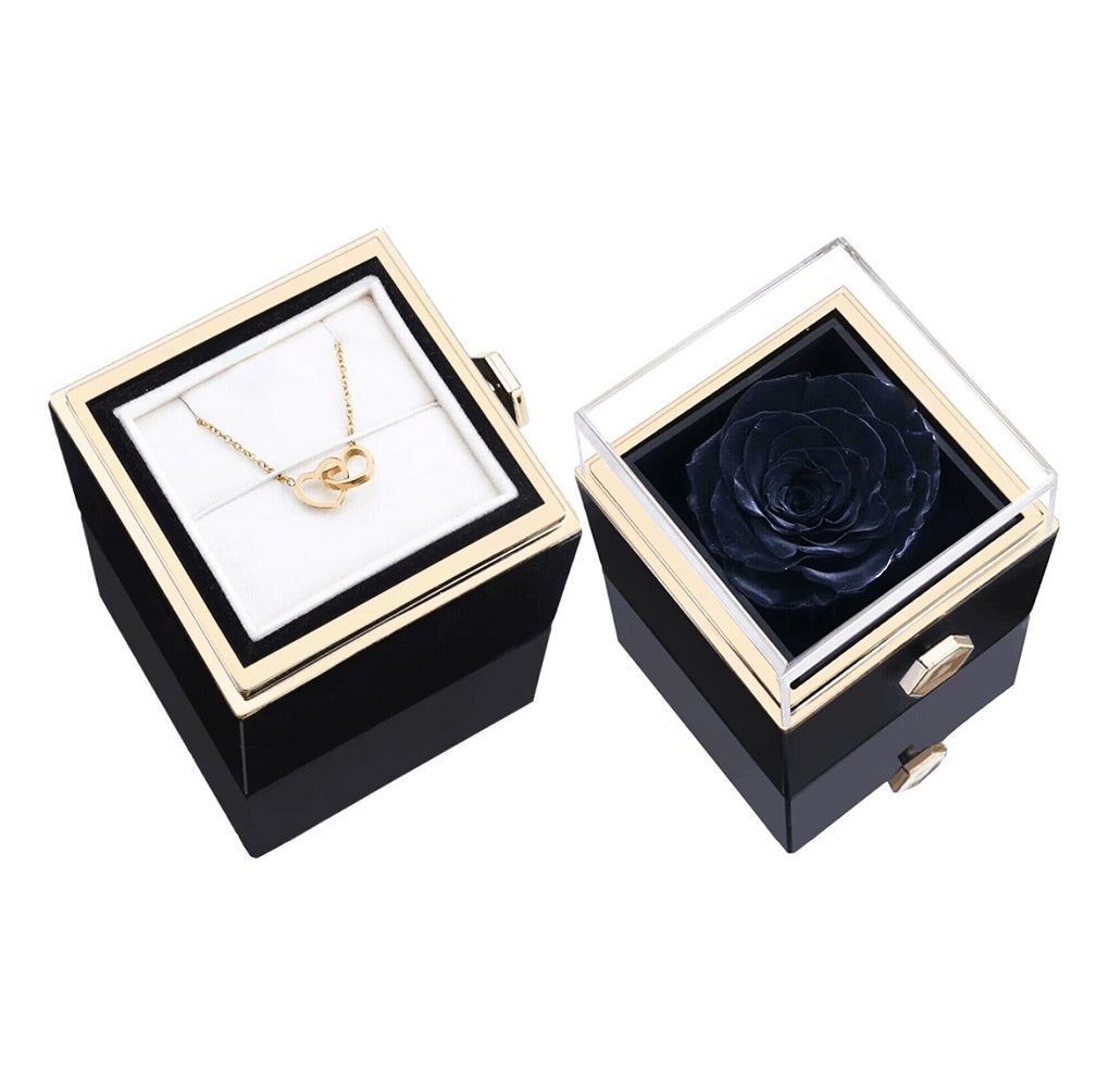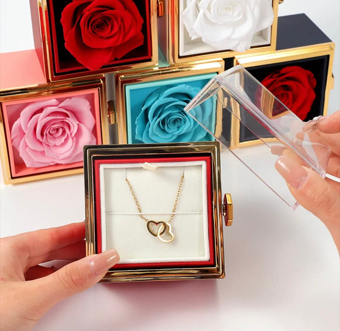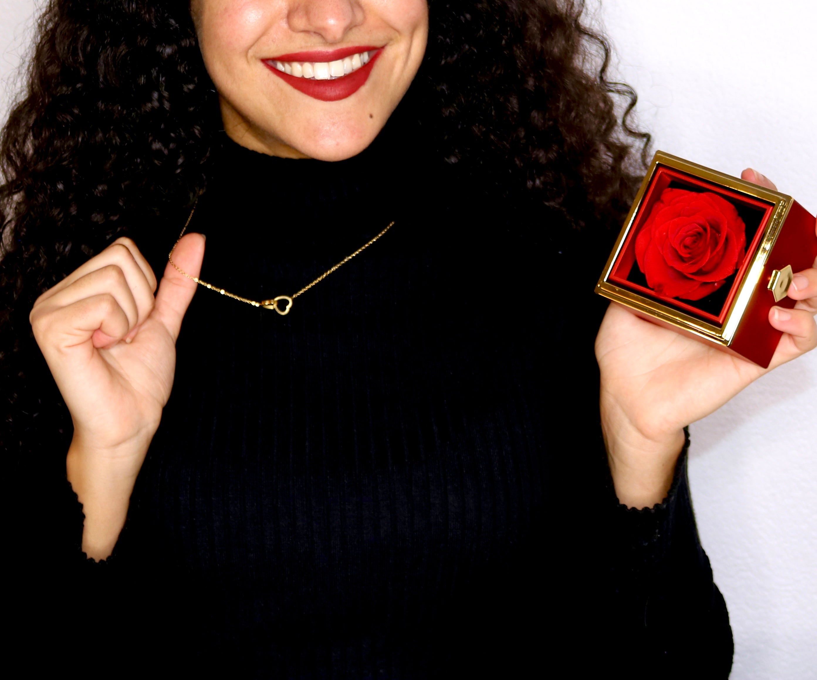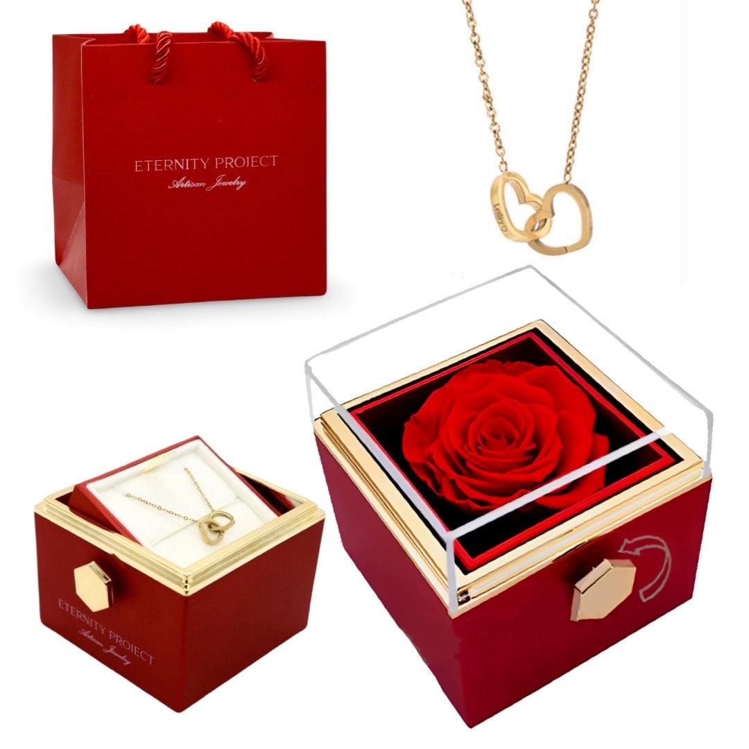 The timeless rose box, which includes a bespoke necklace, is a present that is meant to be forever. A real rose is treated with a patented technology so its authentic beauty never fades, symbolizing eternal love and affection.