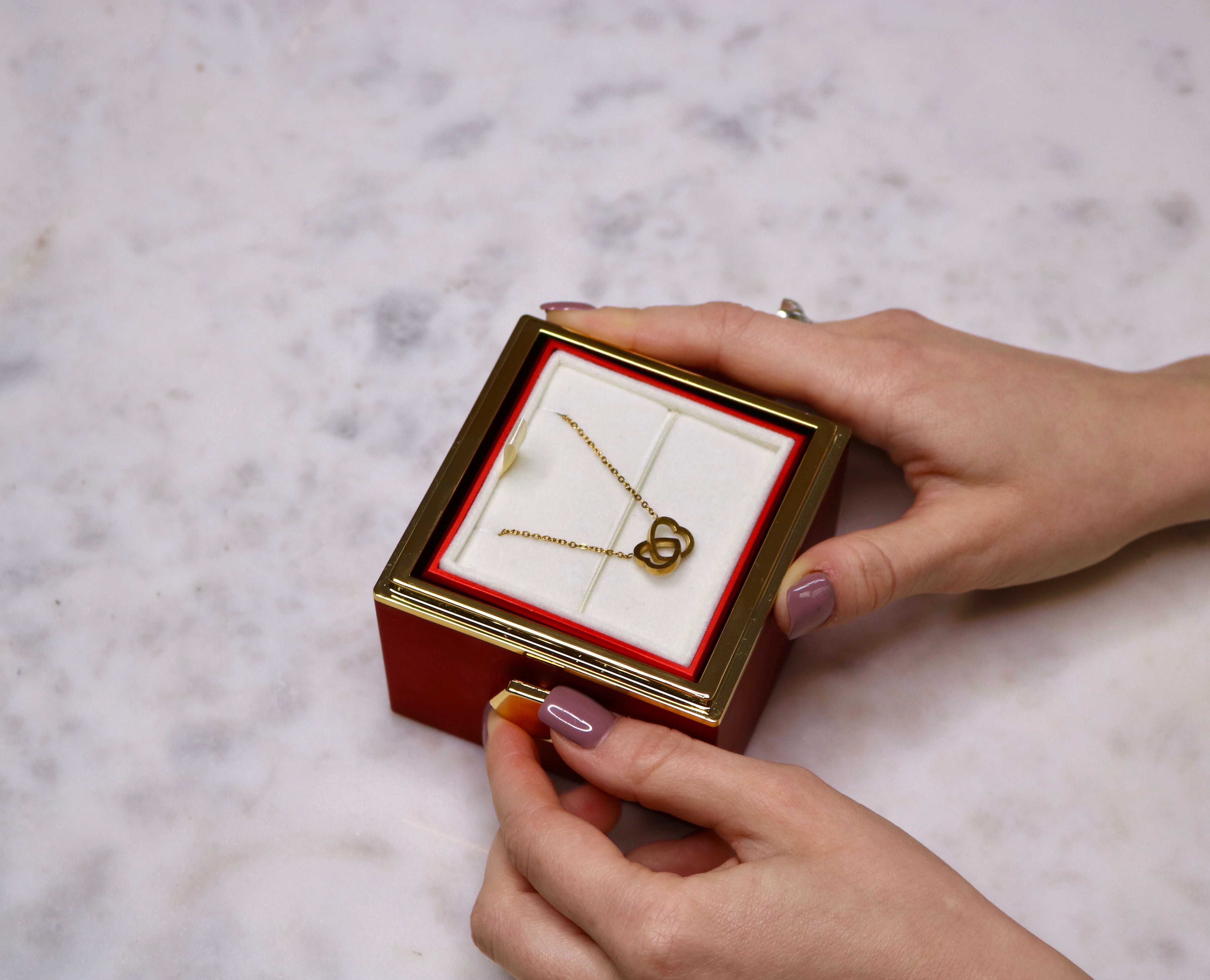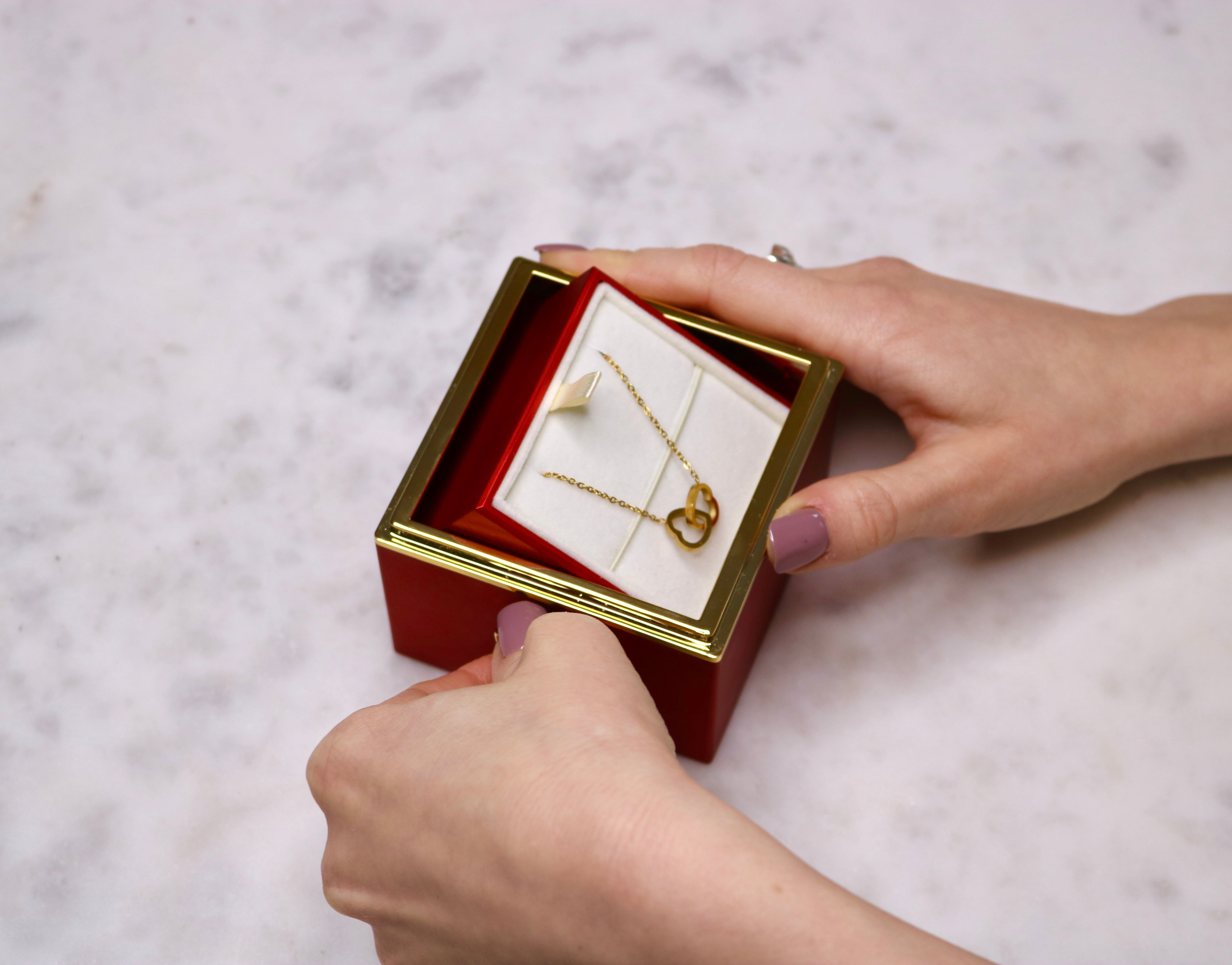 Turning a handle on the side of the box reveals a hidden custom-crafted necklace of two locked hearts with the words of your choice engraved on it. It is made of high quality stainless steel and plated with a layer of genuine 18k Gold, Rose Gold or 925 Sterling Silver. This combination of materials makes it sturdy and virtually untarnishable.