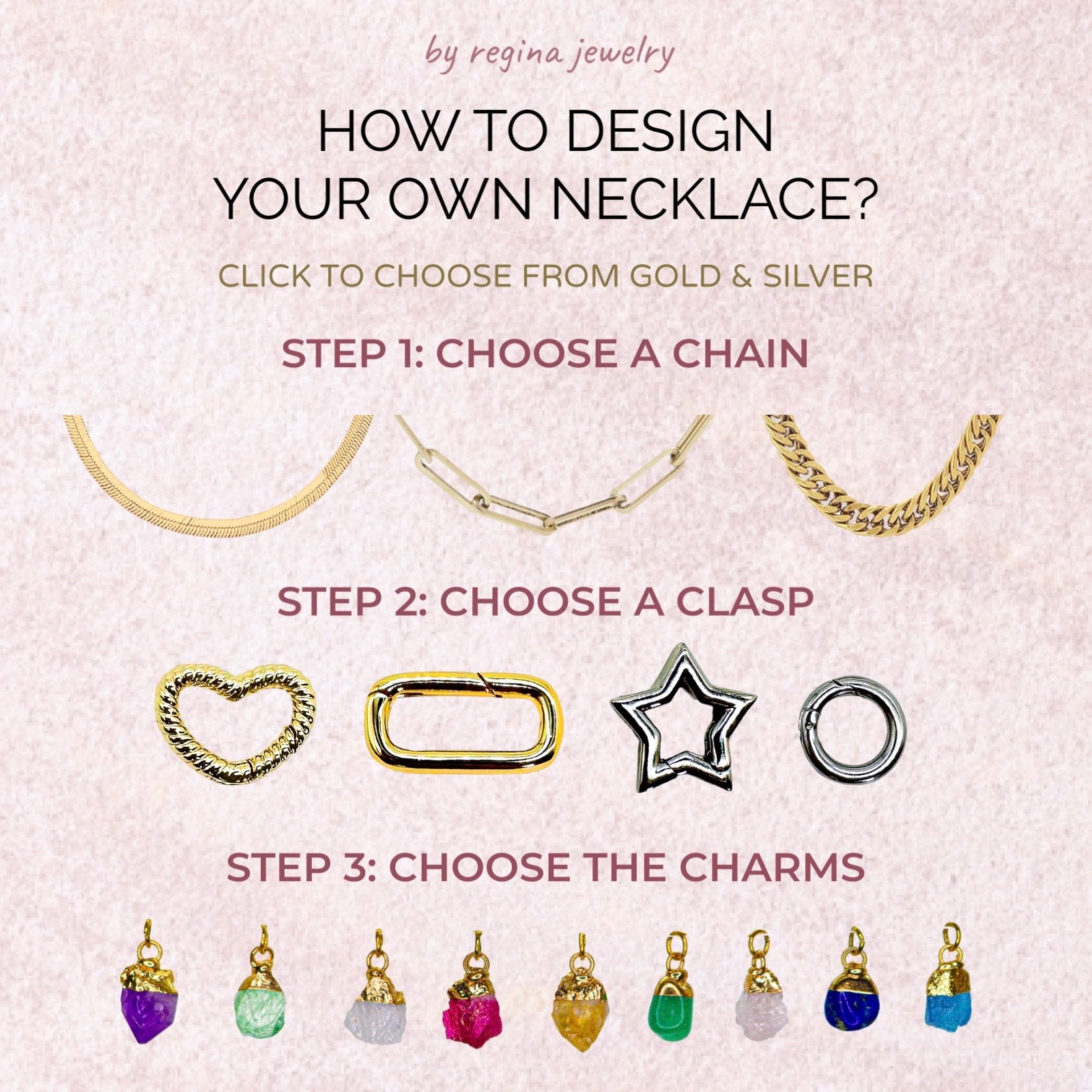 Découvrez VOTRE création – un collier unique. Choisissez chaînes, Des fermoirs et des pierres précieuses authentiques pour le personnaliser exactement comme vous le souhaitez.