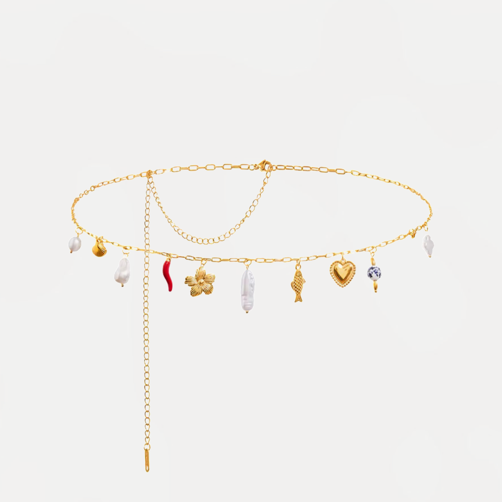 Onze stijlvolle, waterdichte buikketting met bedeltjes heeft een glanzend oppervlak van 18-karaats goud en is verstelbaar. Hij staat fantastisch bij elke crop top of badkleding en geeft je look direct een boost. Deze tailleketting met echte parels en keramische bedeltjes is gemaakt om je er op elke gelegenheid fantastisch uit te laten zien: een festival of het strand.