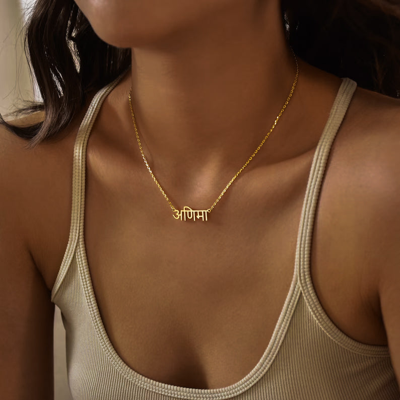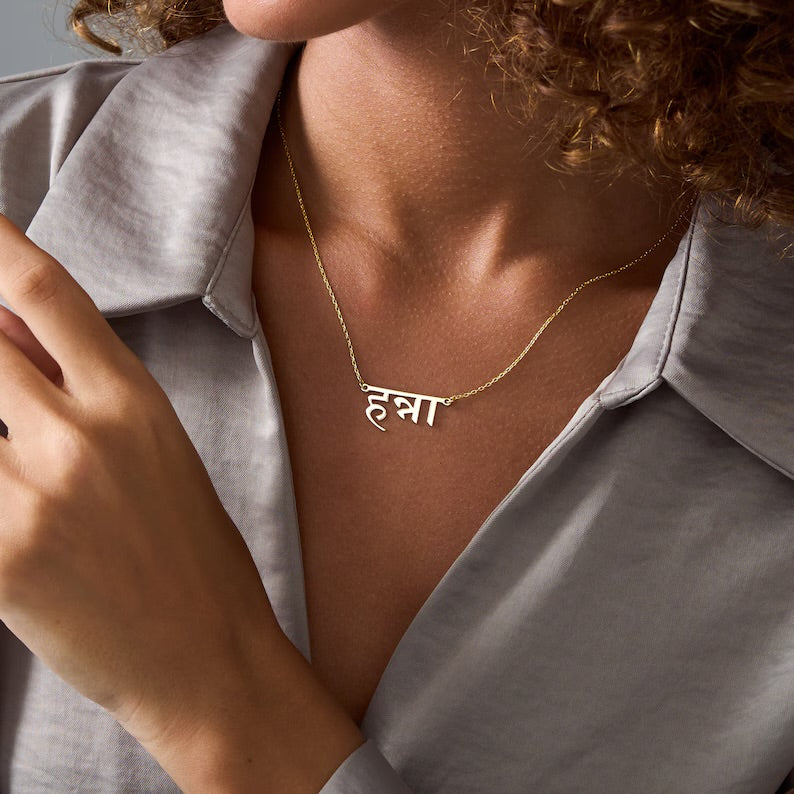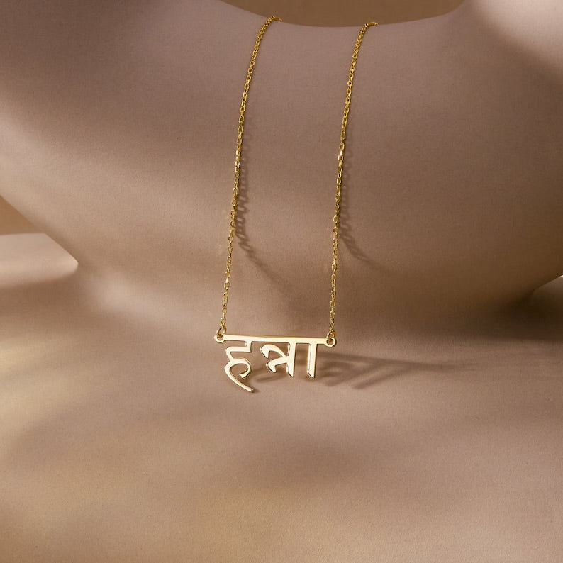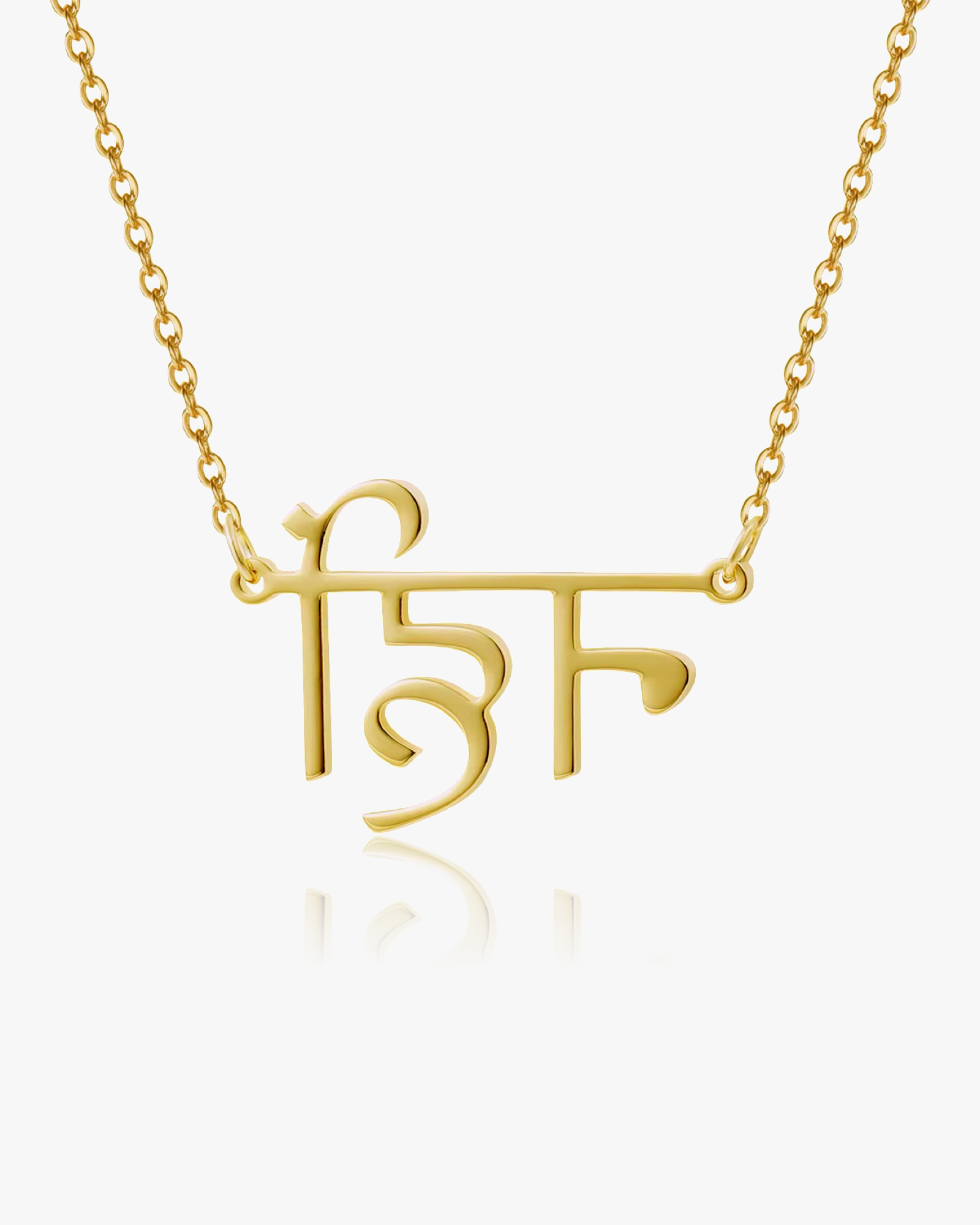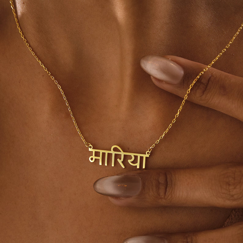 Creëer je persoonlijke en unieke ketting in het Hindi, verkrijgbaar in goud, zilver en roségoud. Combineer dit tijdloze, gepersonaliseerde sieraad met al je looks: het is gemaakt om dagelijks te dragen en verkleurt niet. Onze op maat gemaakte Indiase naamketting is geïnspireerd op de Hindi-kalligrafie. Deze prachtige ketting is klaar om cadeau te geven!