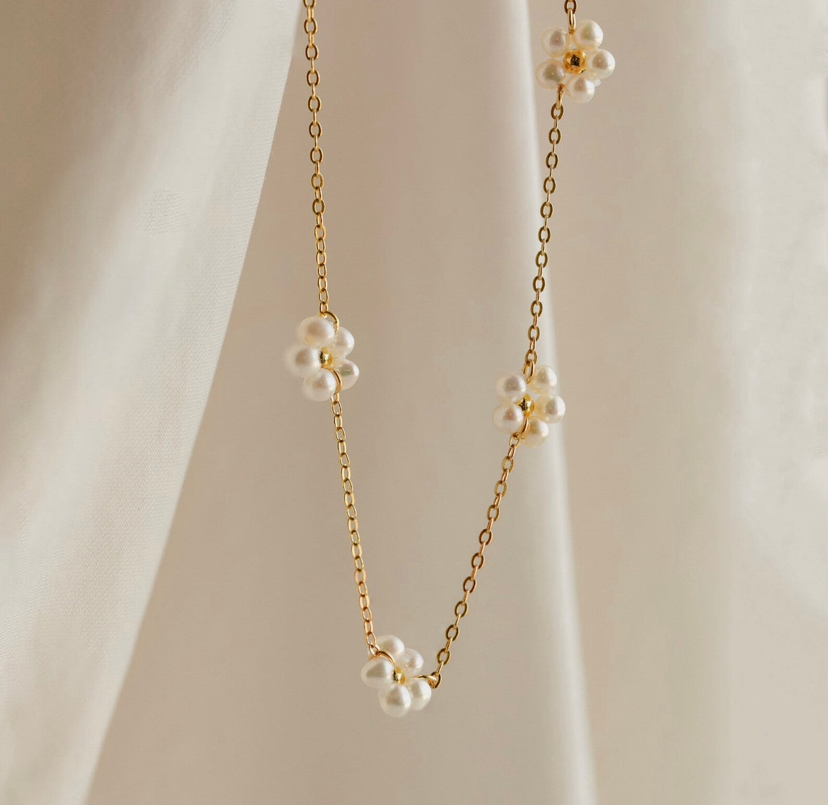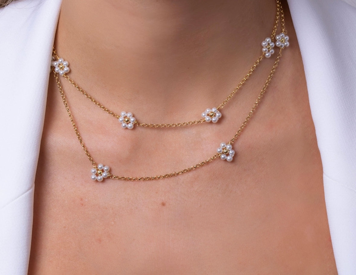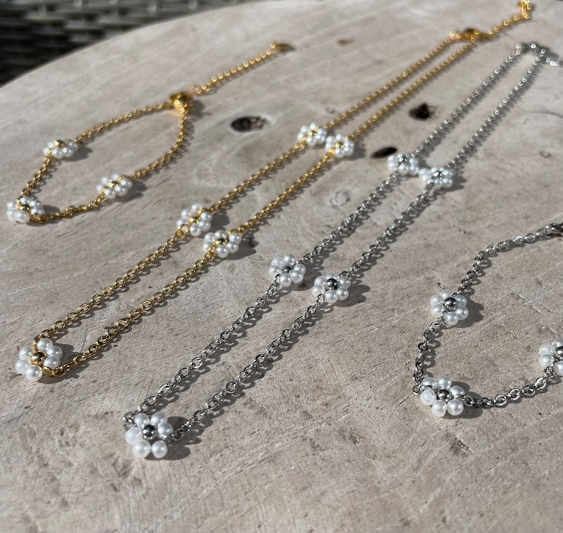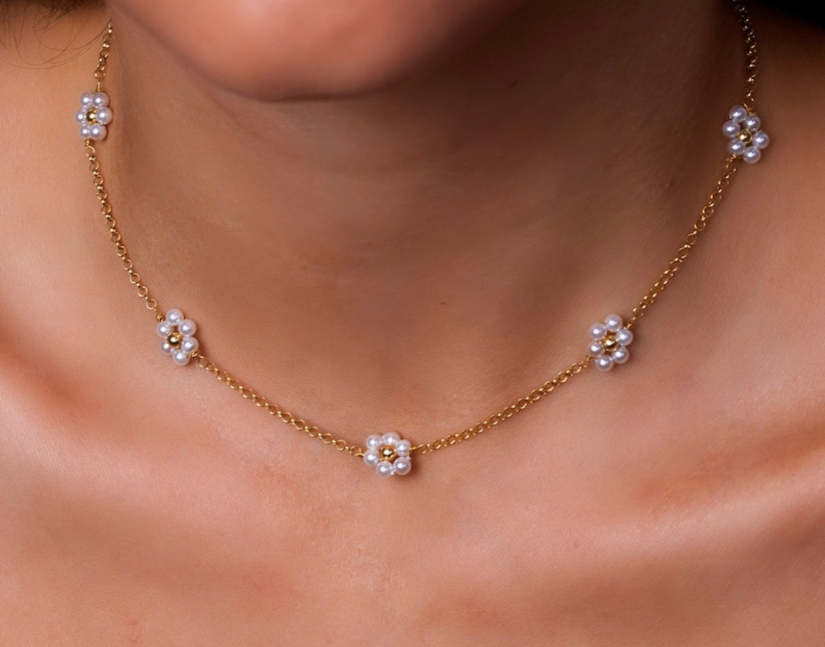 The most beautiful necklace of the season is here. Our Daisy chain necklace features delicate flowers made of pearls. This aesthetically pleasing necklace is a perfect everyday item because it is completely waterproof and is made of premium stainless steel.