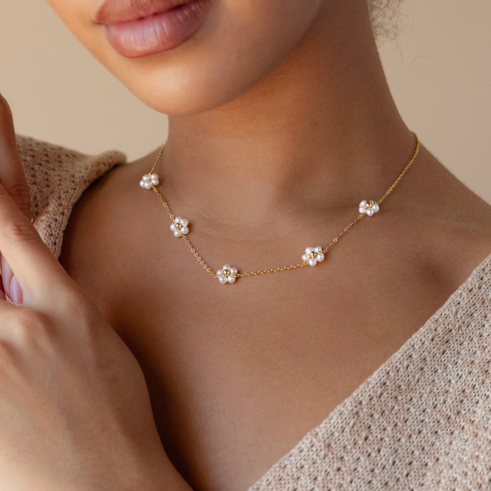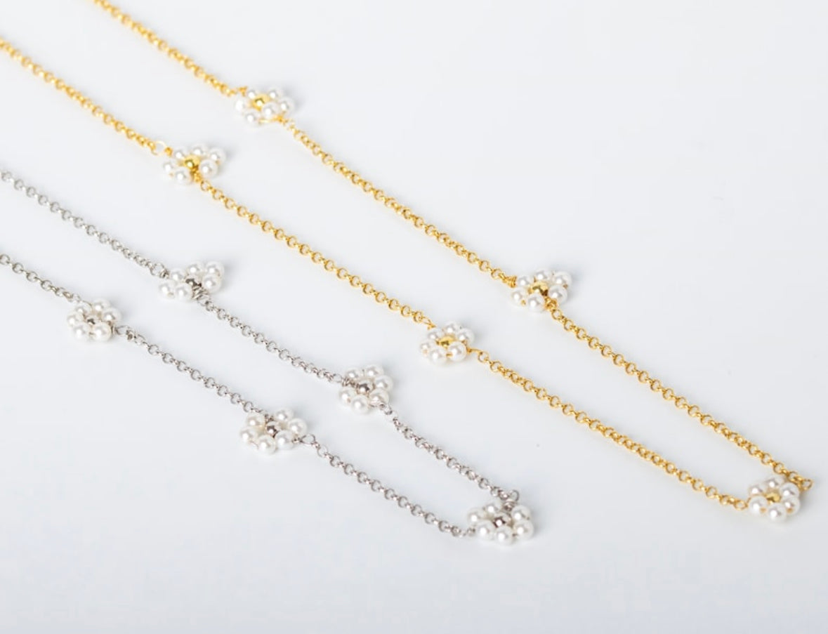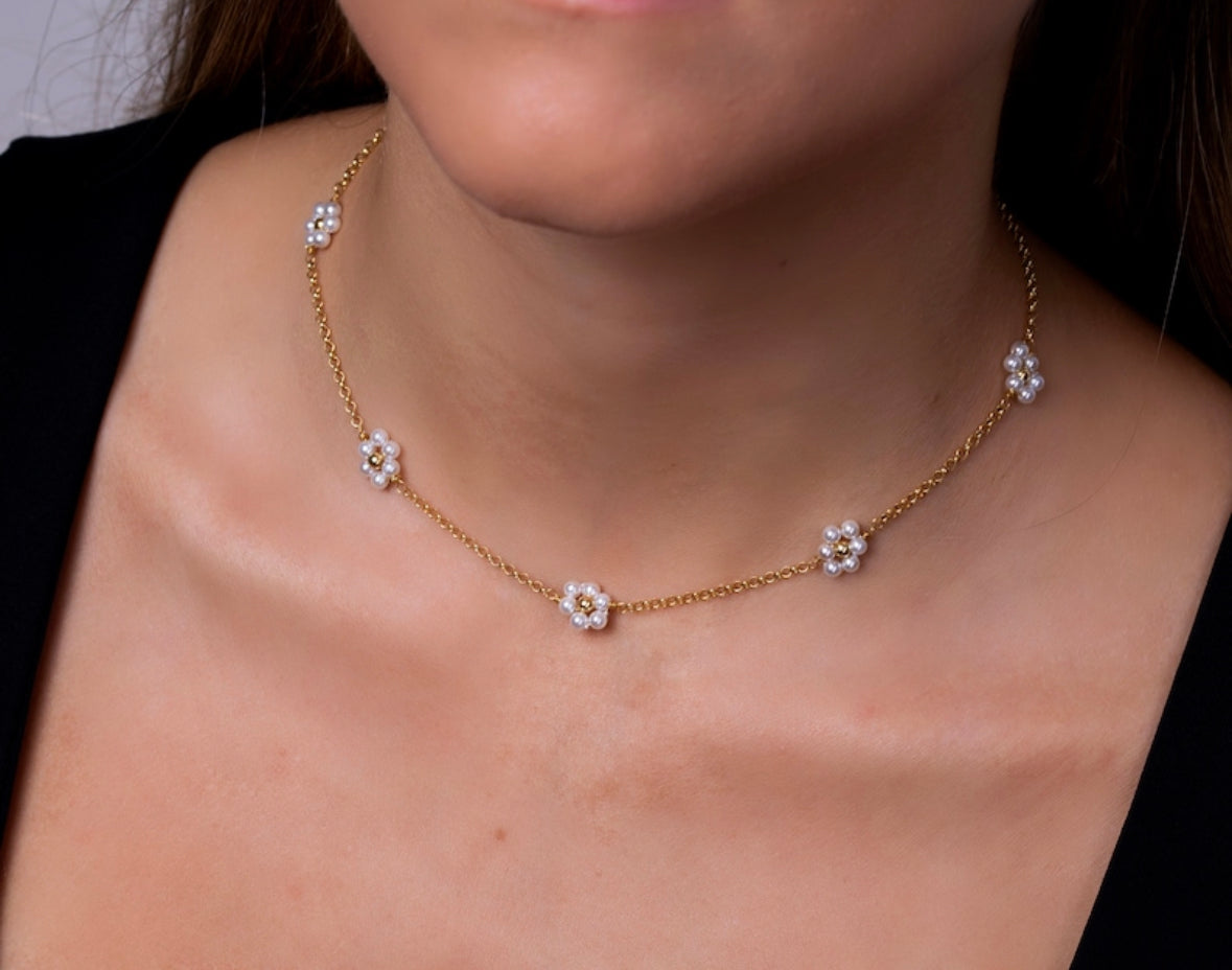 The most beautiful necklace of the season is here. Our Daisy chain necklace features delicate flowers made of pearls. This aesthetically pleasing necklace is a perfect everyday item because it is completely waterproof and is made of premium stainless steel.