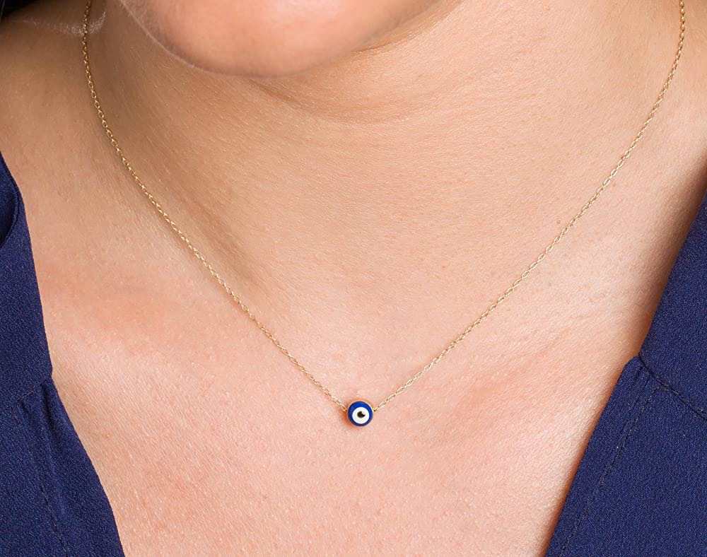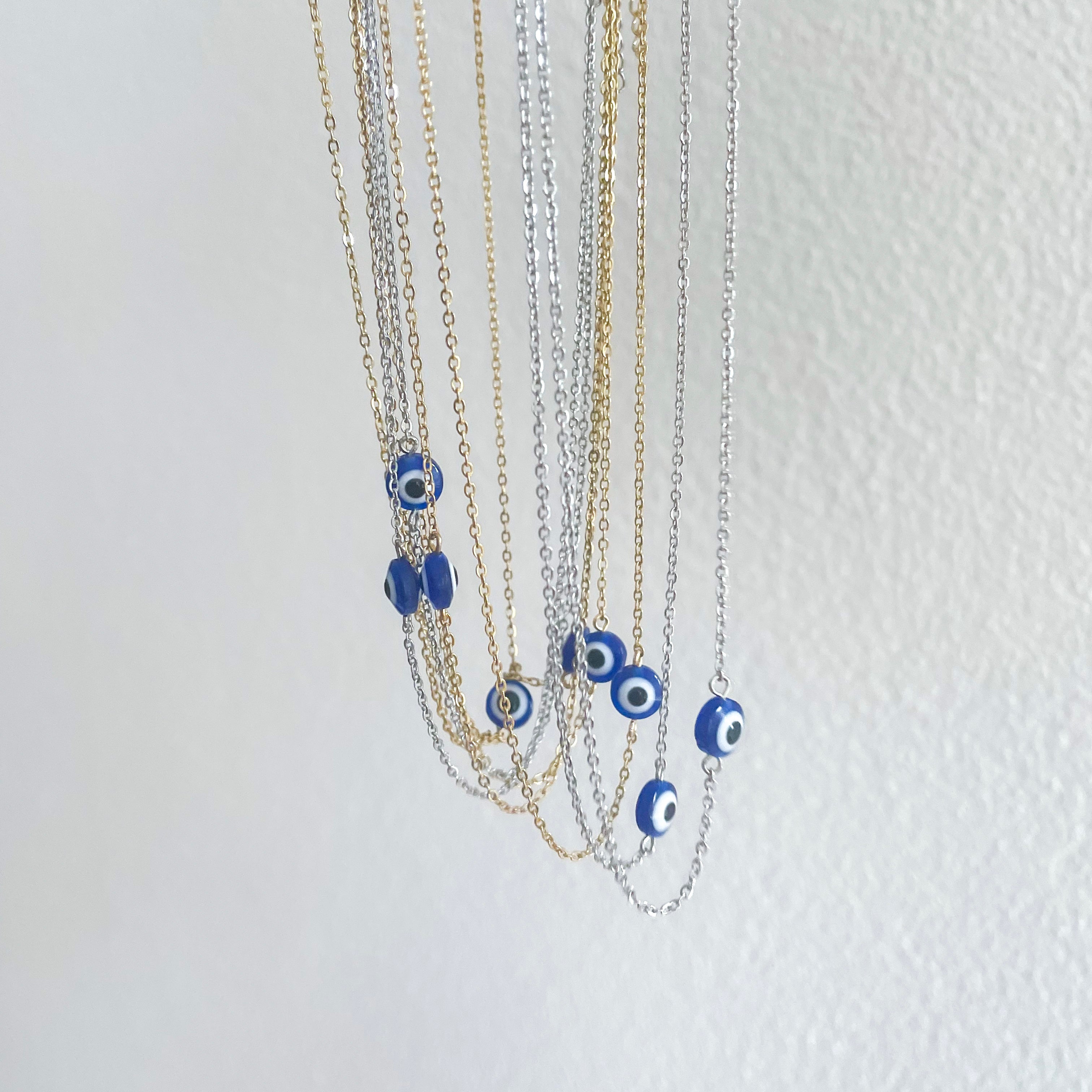 Our tiny evil eye necklace is anti-tarnish, waterproof and has a shimmering 18K gold or silver plated stainless steel chain. The evil eye is a curse believed to be cast by a malevolent glare, usually given to a person when they are unaware. Many cultures believe that receiving the evil eye will cause misfortune. The Evil Eye necklace is created to protect against the malevolent intentions. It will lie perfectly across your neckline and become your favorite everyday companion. Evil Eye necklace is Perfect for layering. And the best part? It's 100% waterproof!