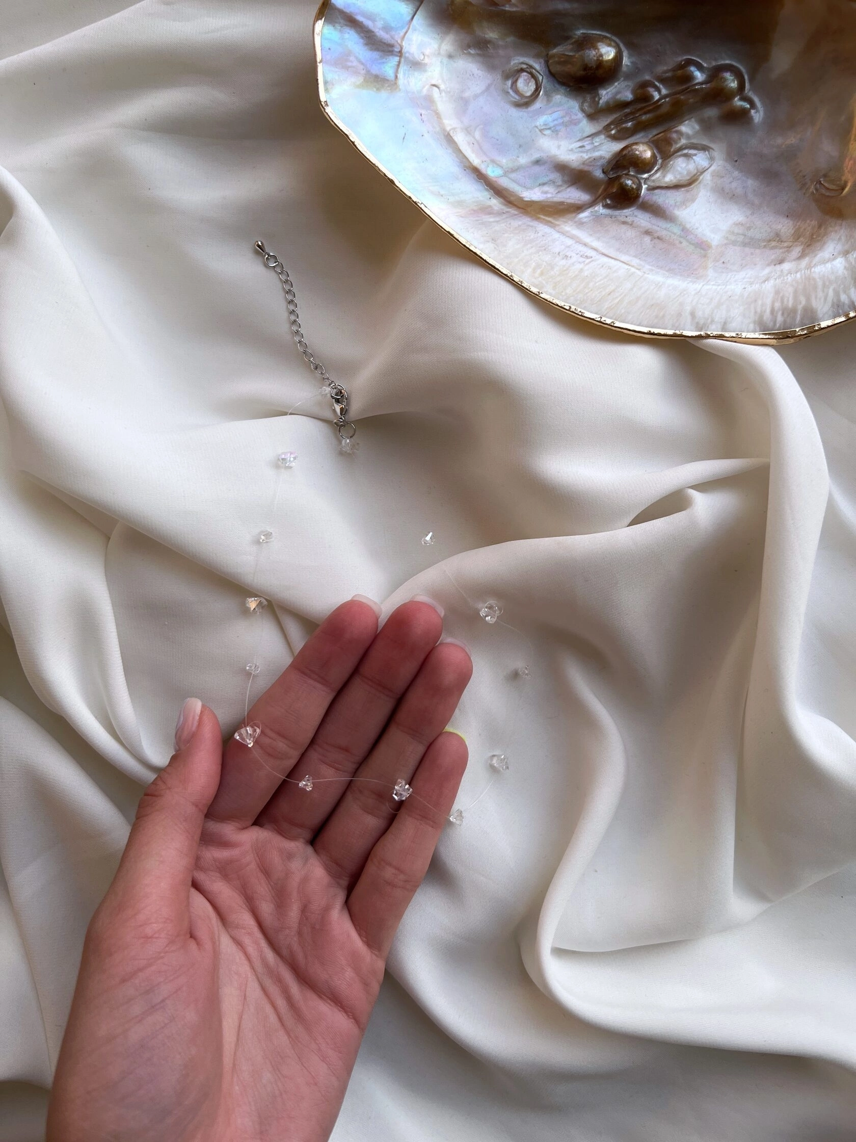 Our hand-made invisible chain necklace with crystals will lie perfectly across your neckline to create the most unforgettable of looks. Perfect for summer season or wedding jewelry selection, this delicate layered necklace with various-sized crystals can be worn at adjustable length, choker style or regular length. And the best part? It's 100% waterproof, as its closure is made of silver plated stainless steel.