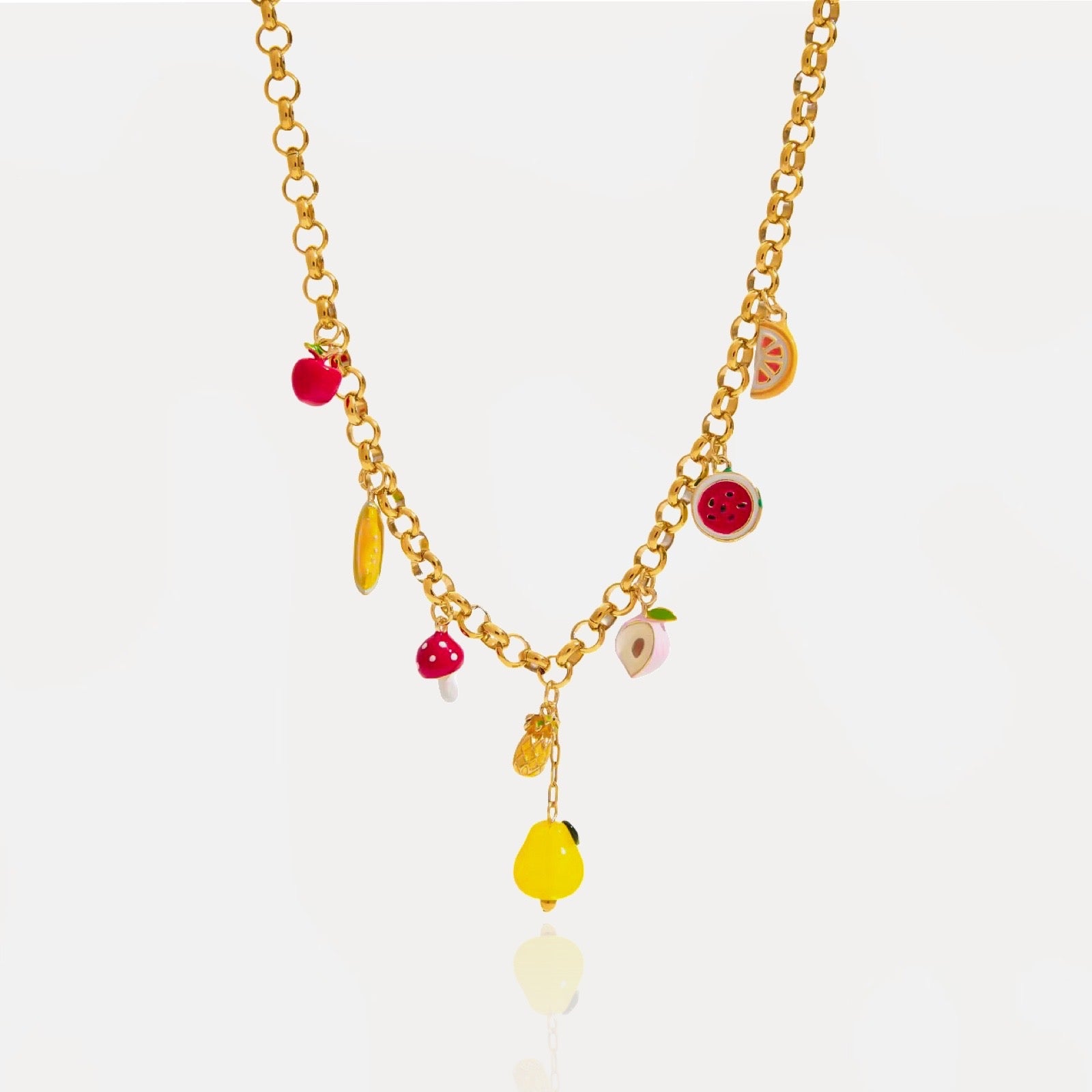 The most beautiful necklace of this summer season is here! Our hand-made Fruit charms bolo chain necklace celebrates positivity and fun. It features delicate mushroom, pear, peach and banana charms. This aesthetic statement beach-friendly necklace is a perfect everyday item because it is completely waterproof and is made of premium stainless steel.