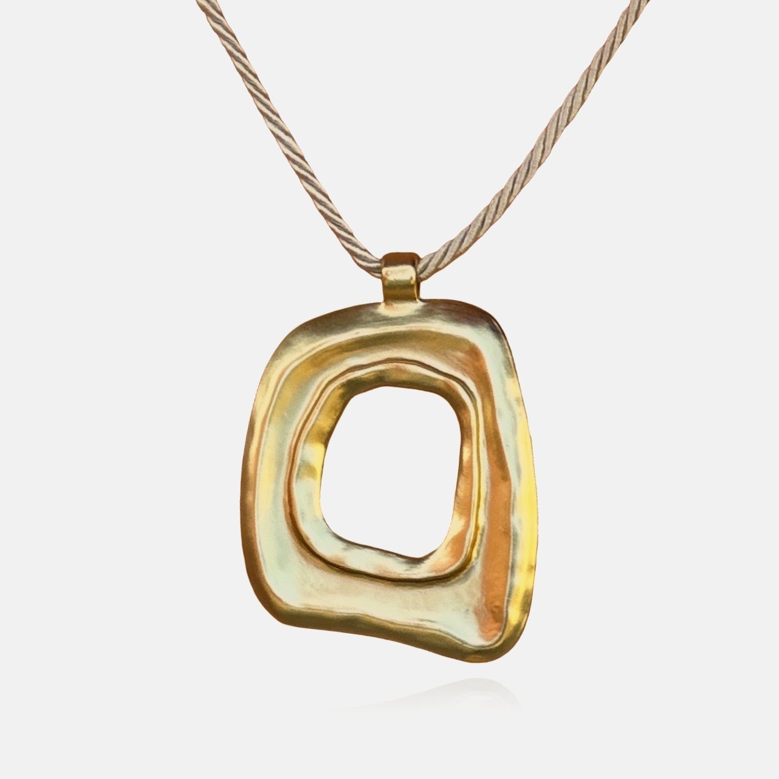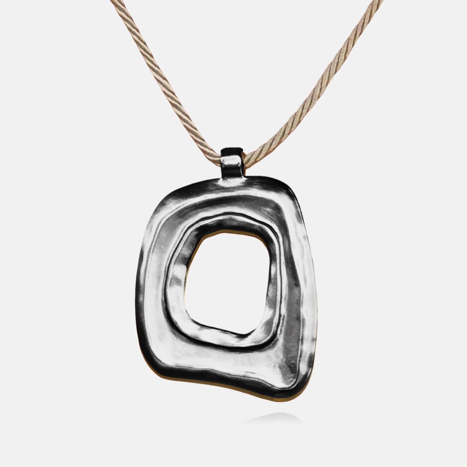 Our molten geometric shape maximalist necklace is stylish, gold- or silver-plated and features an beige cord. It will lie perfectly across your neckline to create the most iconic looks. It is a true work of art! Perfect for layering, this necklace will look beautiful when worn with any chain or pendant. It has an adjustable chain and can be worn at different lengths.