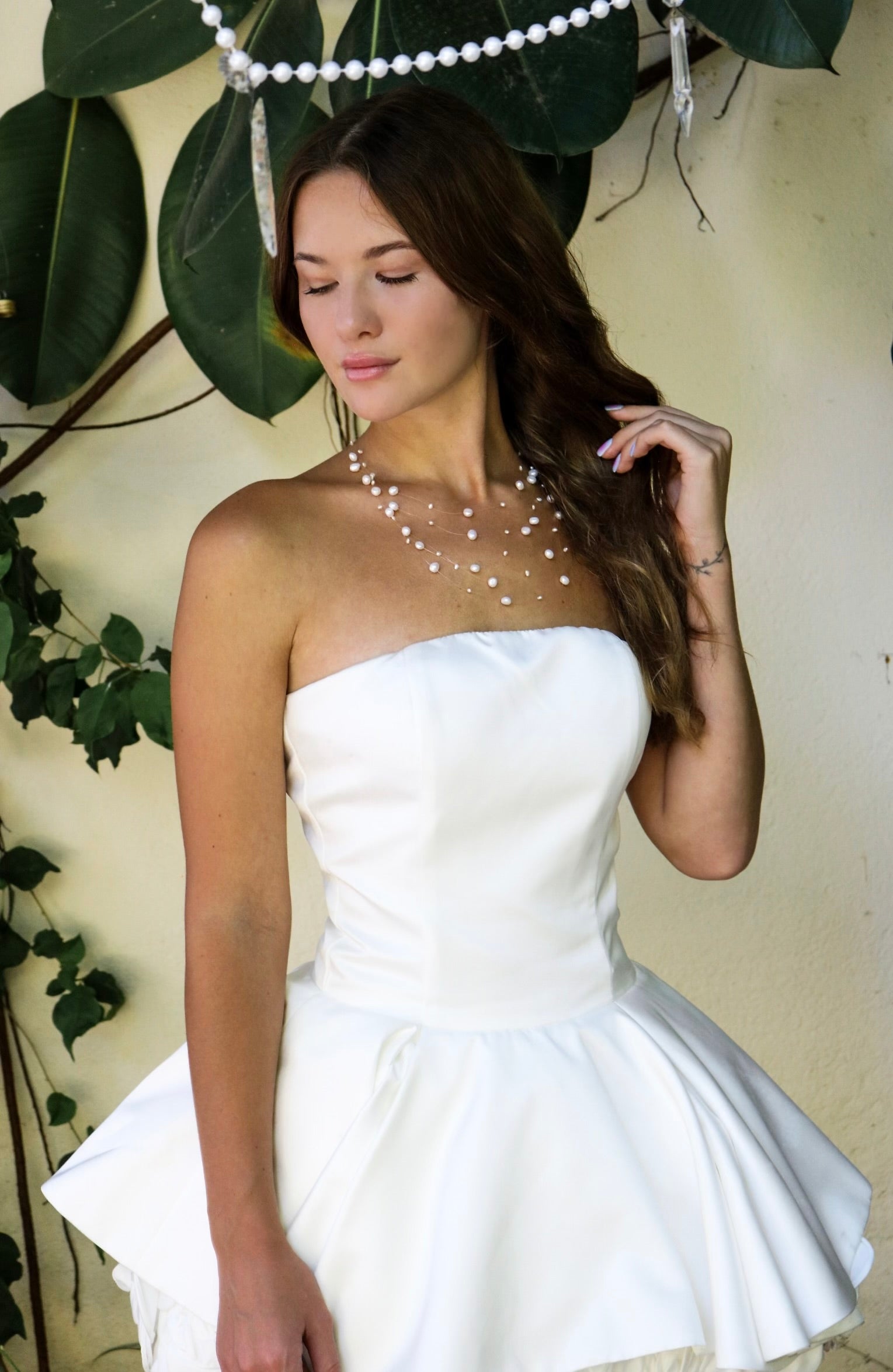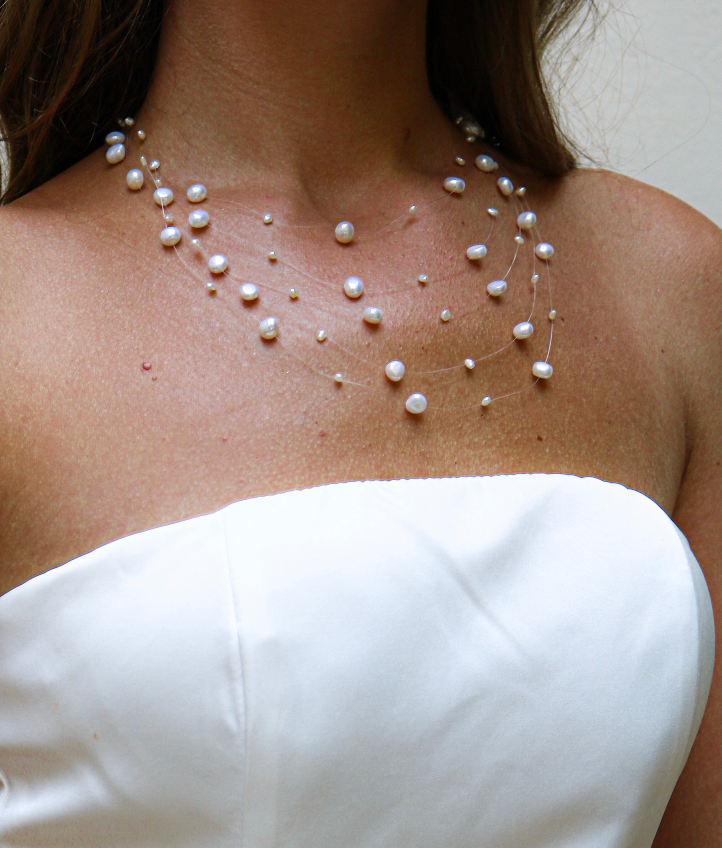 Our hand-made natural freshwater pearl necklace on an invisible transparent fishing line will lie perfectly across your neckline to create the most unforgettable of looks. Perfect for summer season or wedding jewelry selection, this delicate layered necklace with irregular pearls can be worn at adjustable length, choker style or regular length. And the best part? It's 100% waterproof, as its closure is made of silver plated stainless steel.