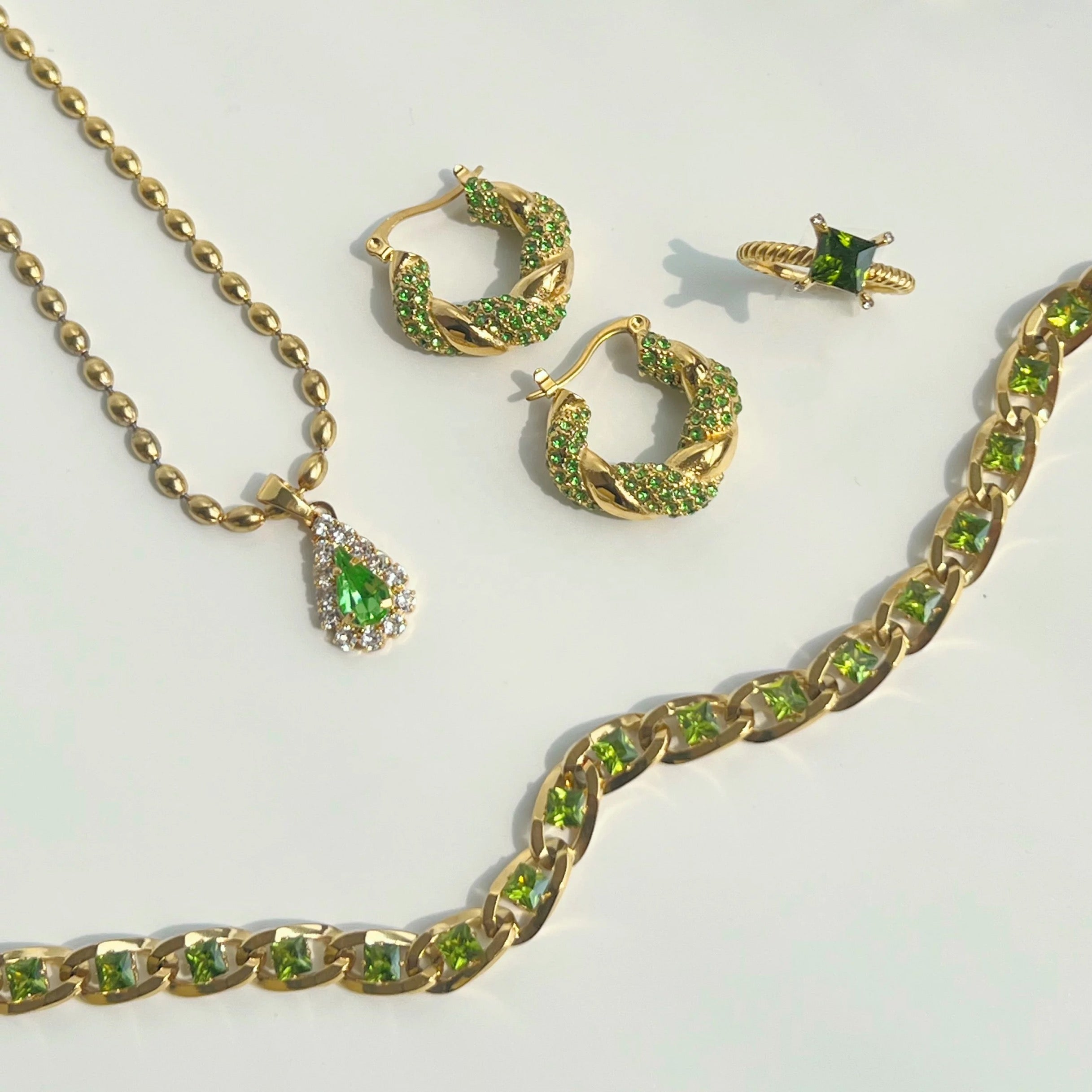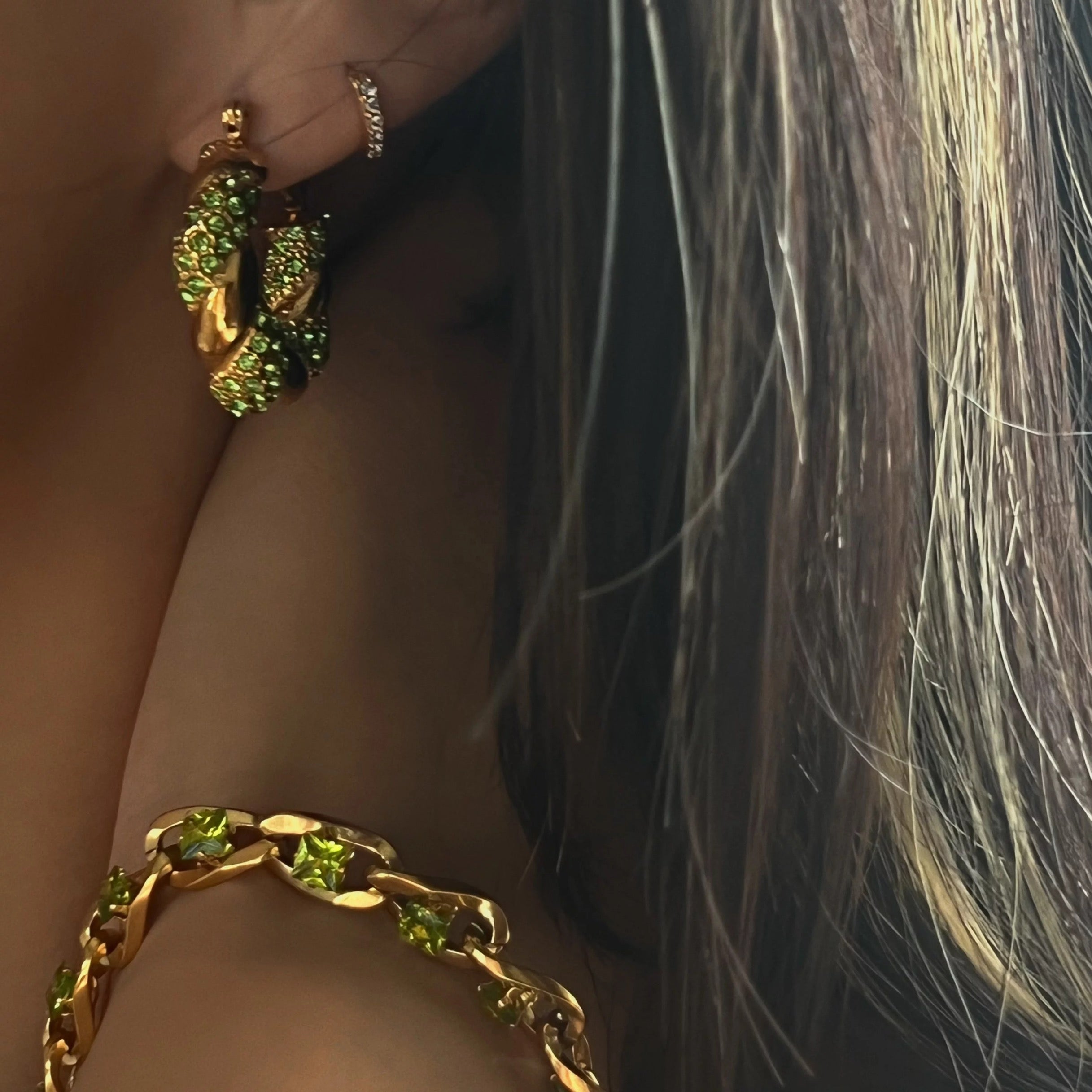 Our elegant micro pave crystal hoop earrings will instantly elevate your look add an extra sparkle to your life. These beauties come in magical lime green stone colors and will make you stand out from the crowd on any occasion. They are 100% waterproof, 18K gold plated over premium stainless steel, so you can swim and shower in them as much as you want. They make a perfect gift for someone special.
