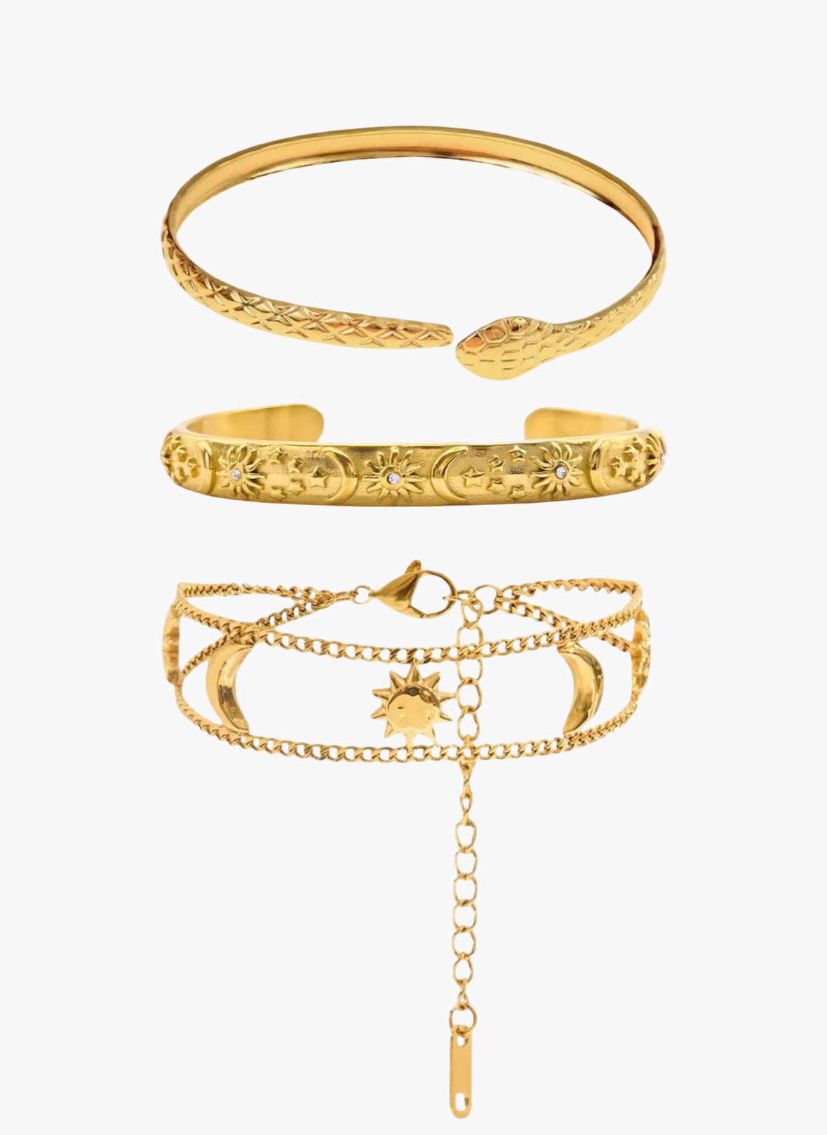Set includes 3 Bracelets: Sun and Moon bracelet, Sun and Moon bangle, Snake bangle