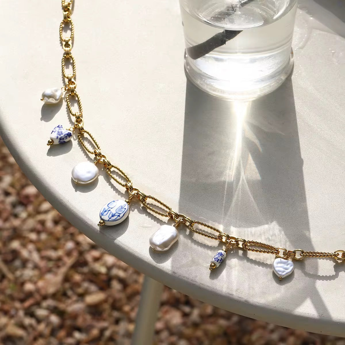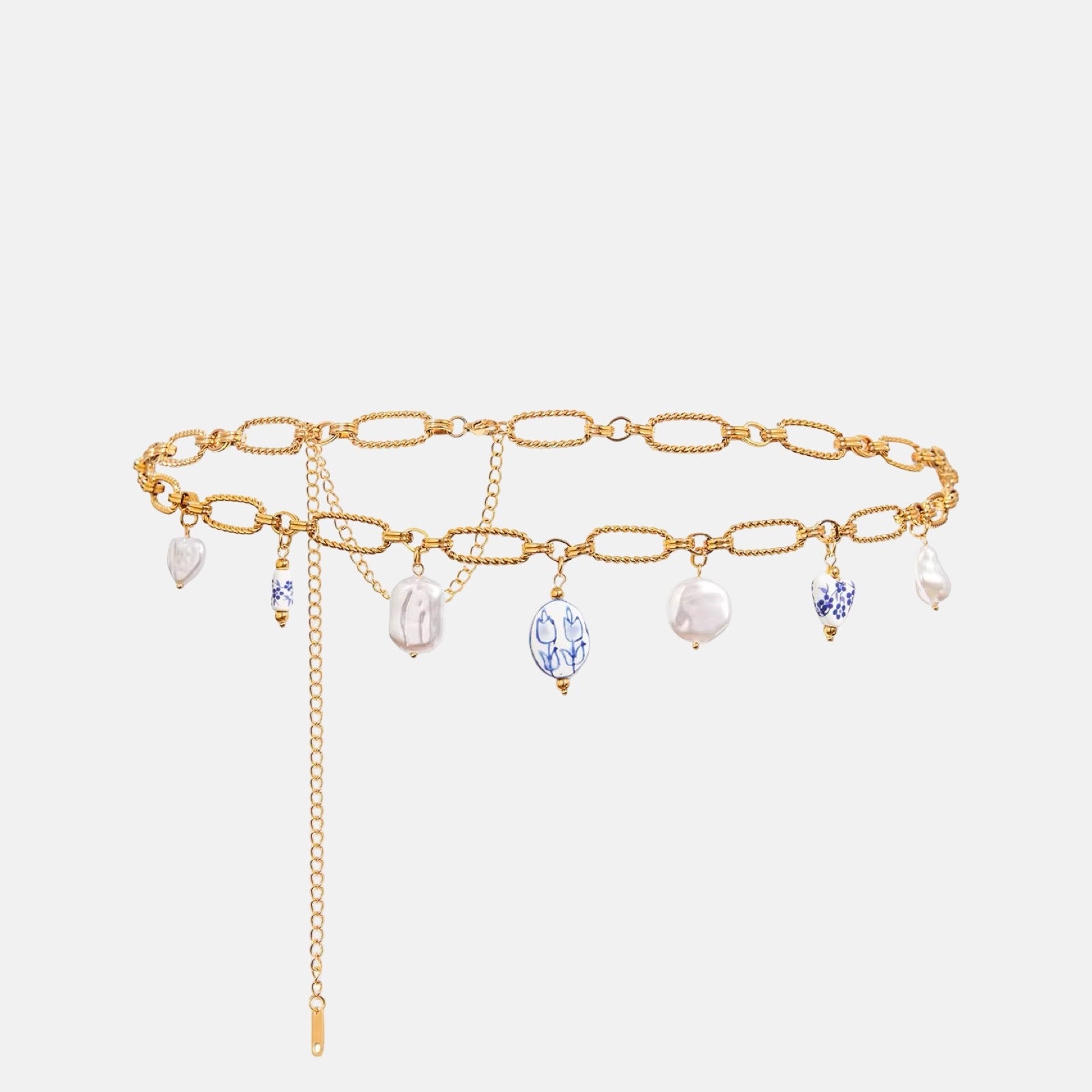 Our stylish waterproof belly chain with charms has a shimmering 18K gold surface and can be adjusted in size. It will look amazing with any crop tops or swimwear and instantly elevate your look. This real pearl waist chain with ceramic porcelain charms is created make you look stunning at any occasion: a festival or the beach.