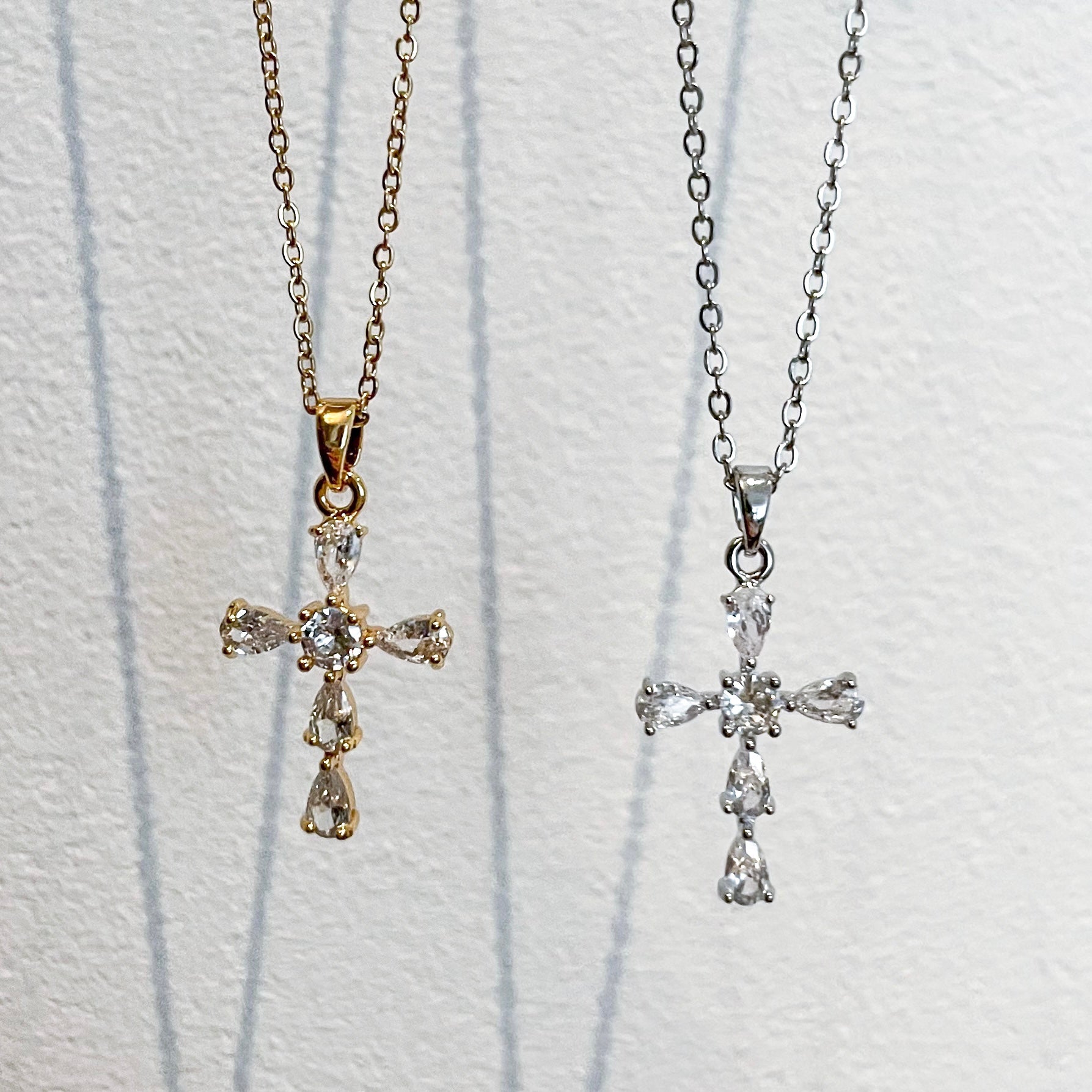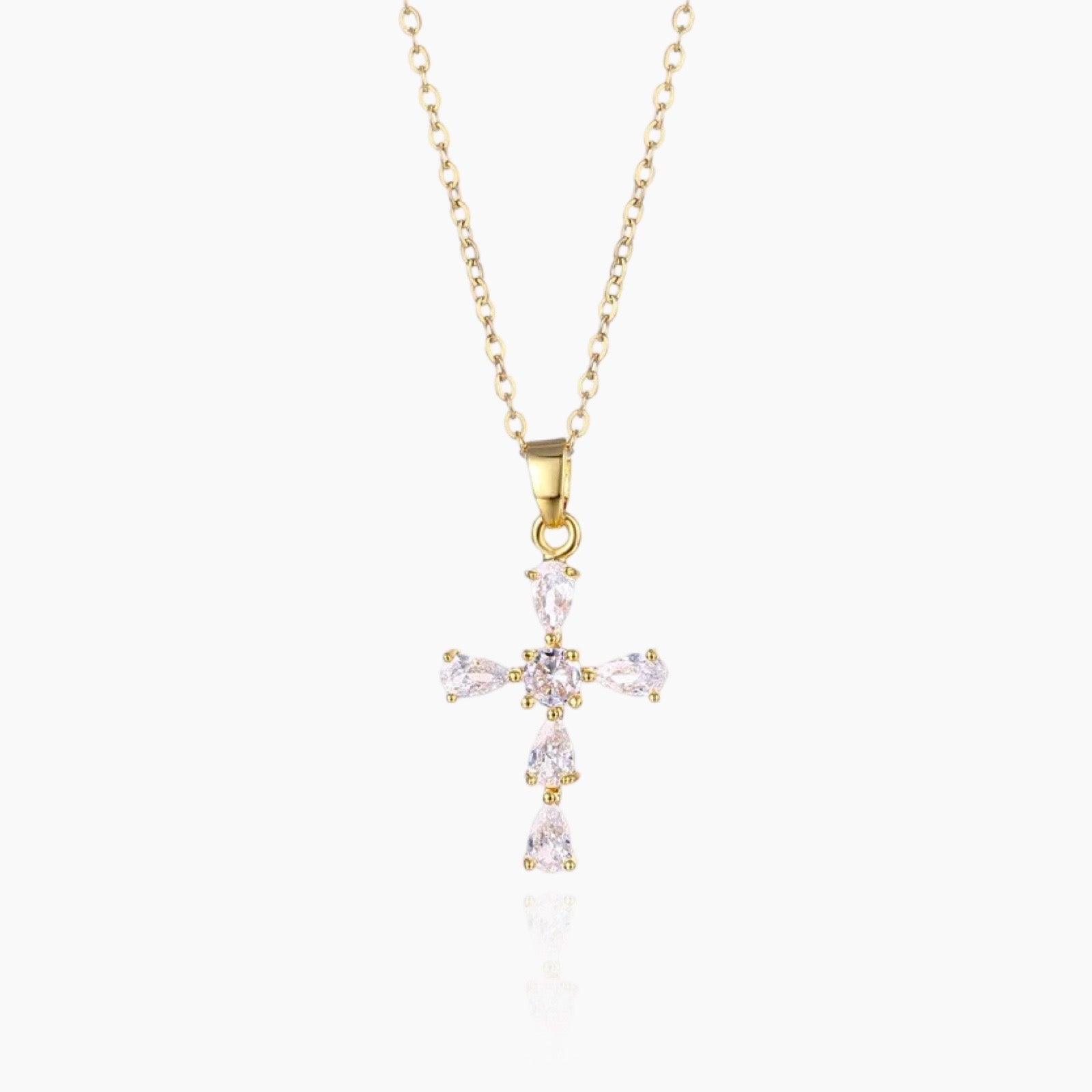 Our elegant crystal cross necklace is anti-tarnish, gold plated over stainless steel and adorned with precious CZ stones. It will lie perfectly across your neckline to create the sleekest of sleek looks. Perfect for layering, this necklace will look beautiful when layered up with any chain or pendant. And the best part? It's waterproof!
