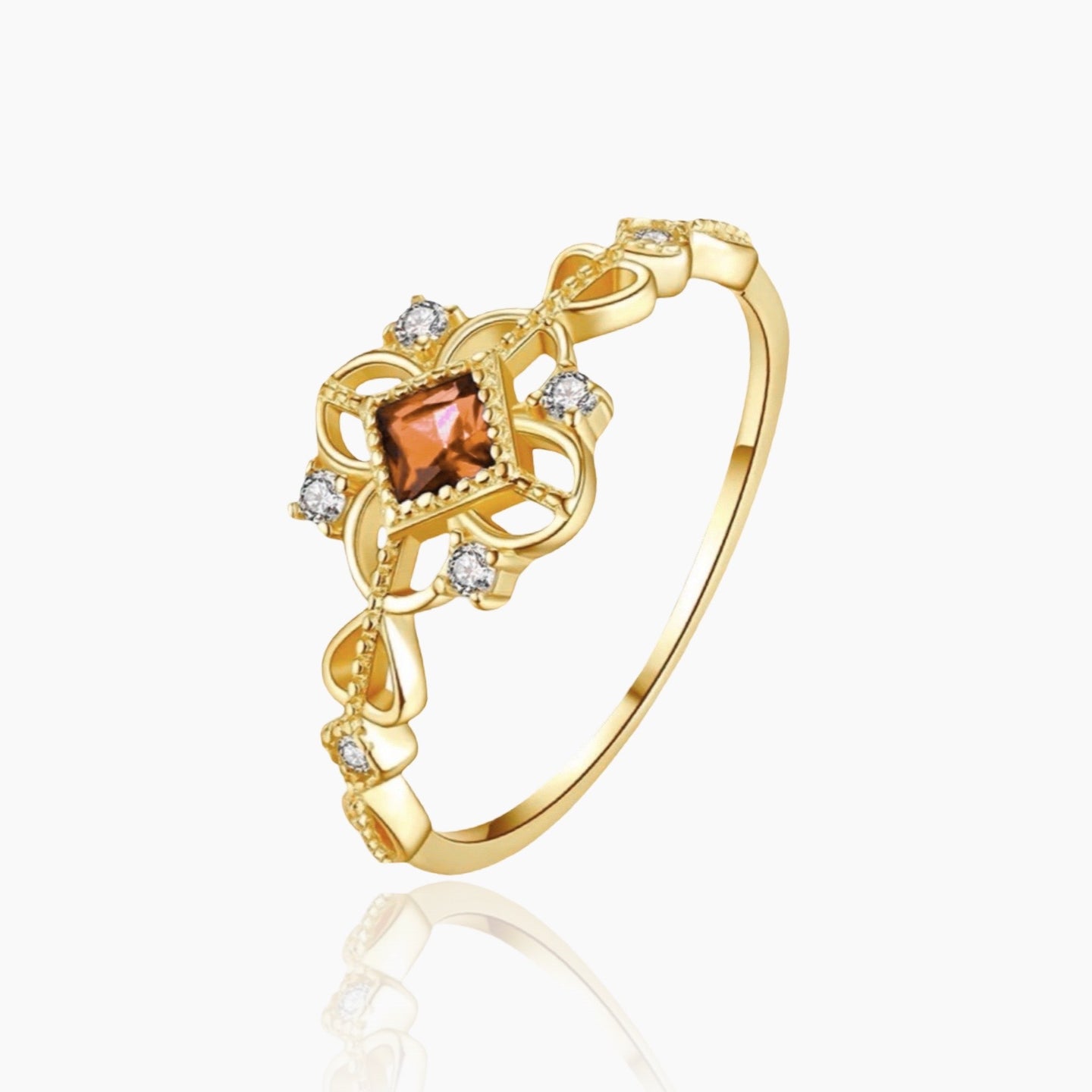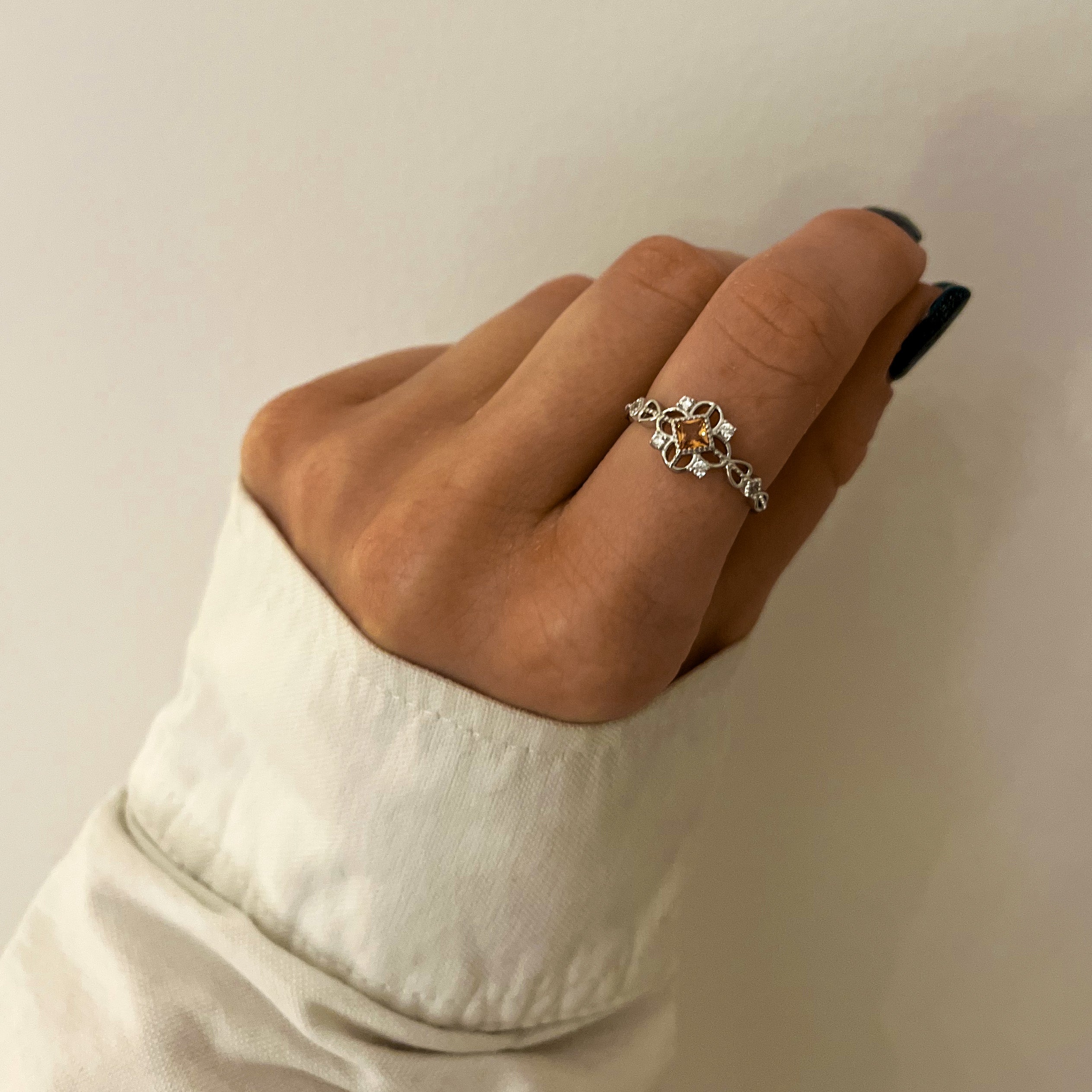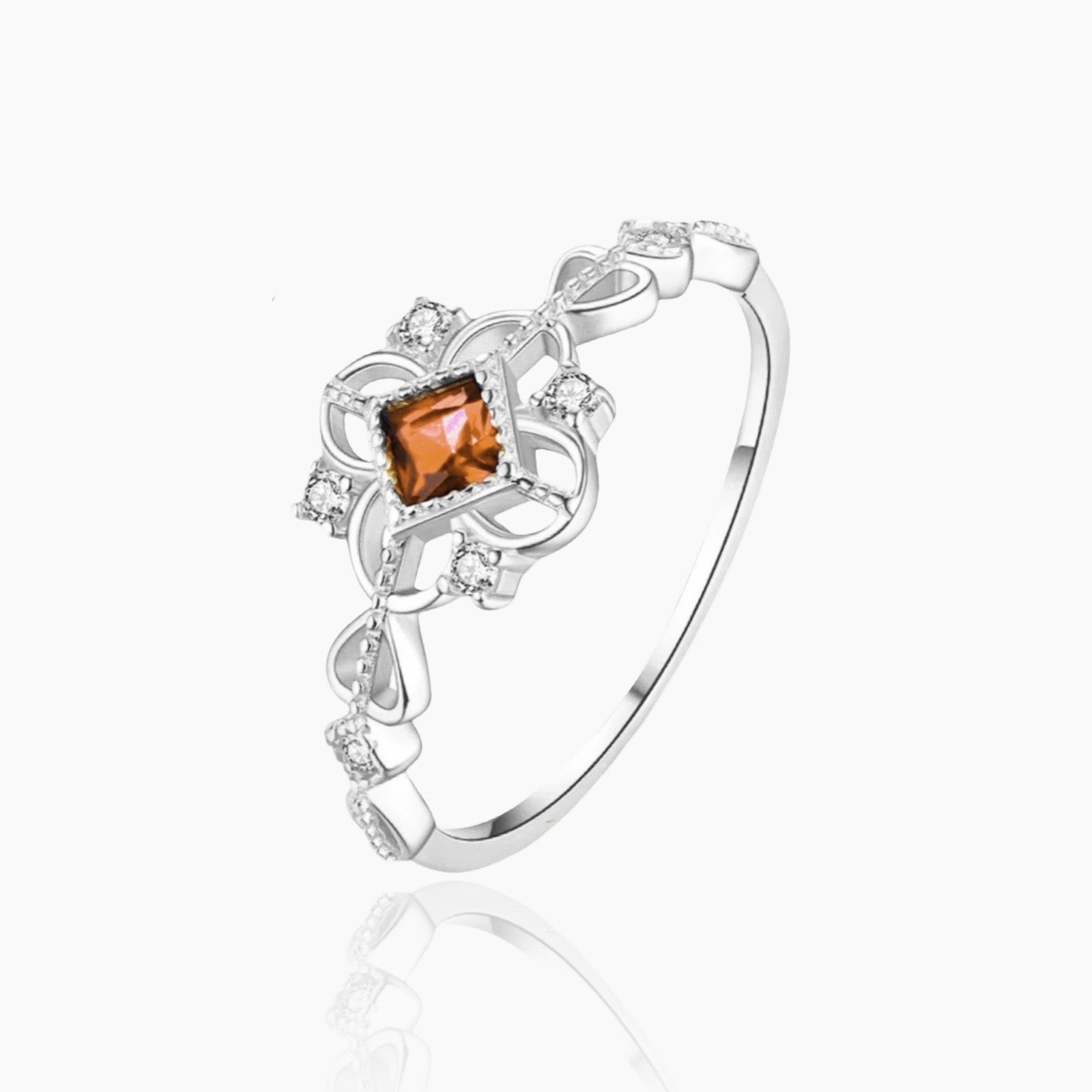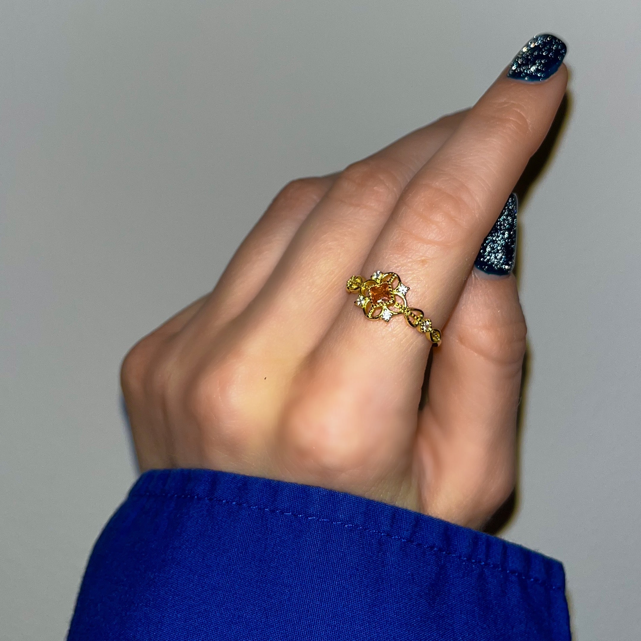 Becoming royalty is easy: just put on our luxurious orange stone ring. It is adorned with beautiful crystals and has a pure 925 Sterling Silver base, so it is completely waterproof and will stay beautiful forever. The ring fits all sizes because it has an adjustable base. This ring is a responsible choice: its aesthetic is timeless, so you can pass it down the generations. It looks classy and makes a perfect gift for someone special.