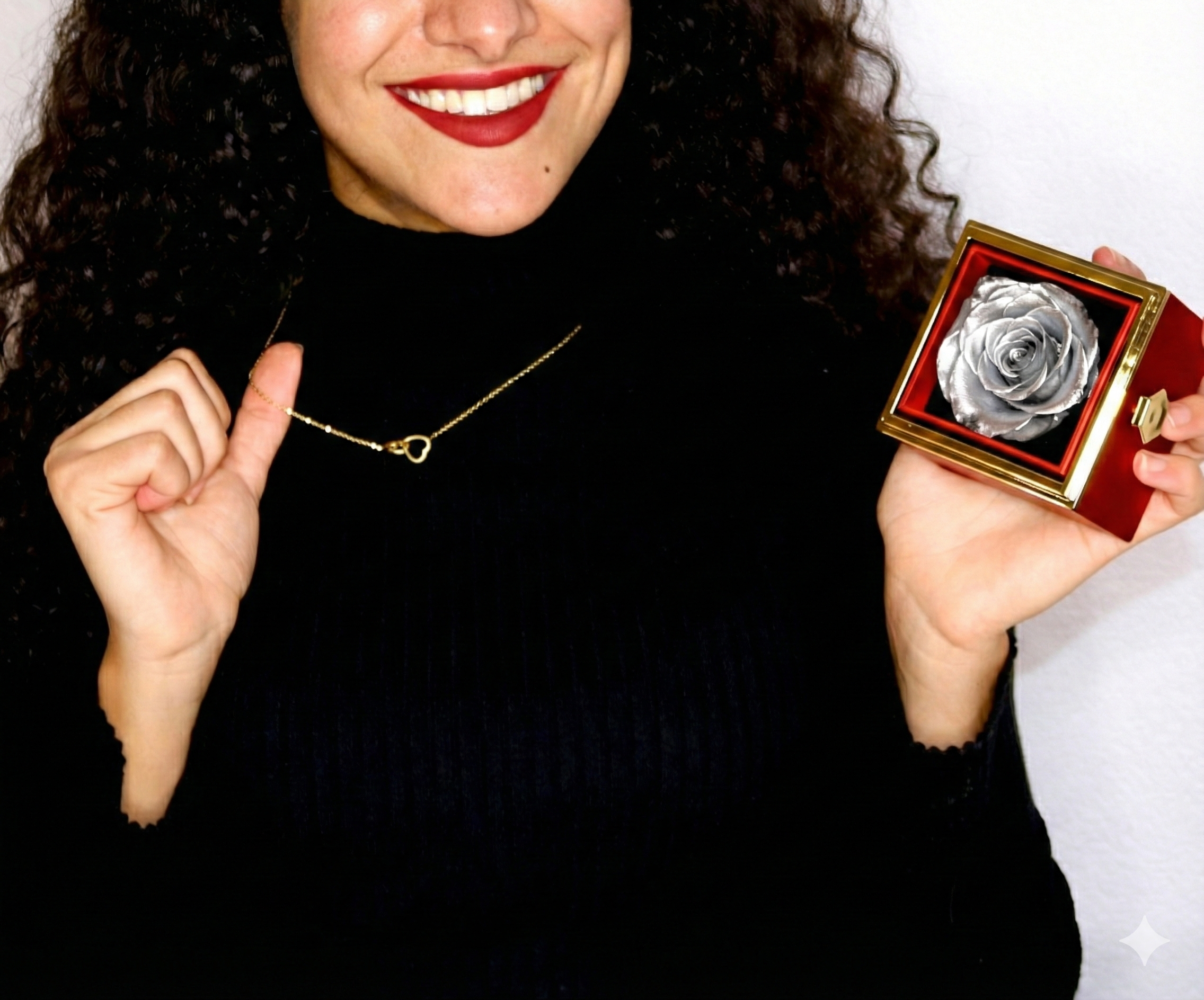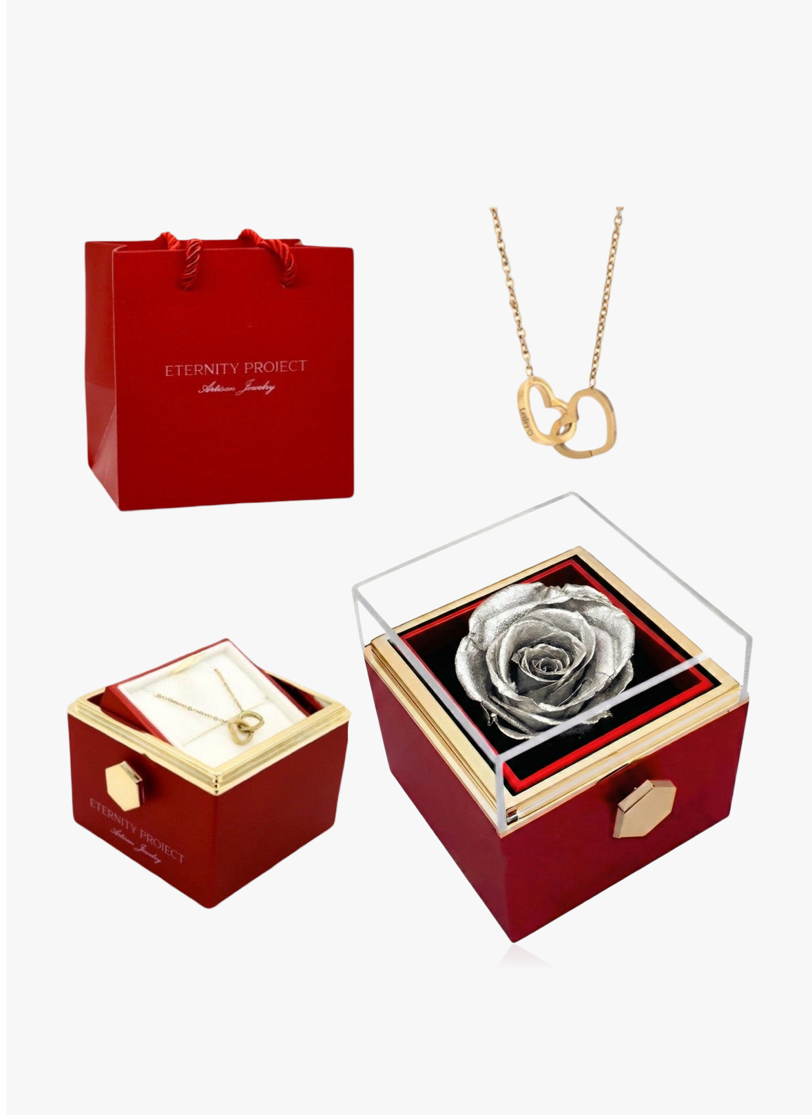 Turning a handle on the side of the box reveals a hidden custom-crafted necklace of two locked hearts with the words of your choice engraved on it. It is made of high quality stainless steel and plated with a layer of genuine 18k Gold, Rose Gold or 925 Sterling Silver. This combination of materials makes it sturdy and virtually untarnishable.