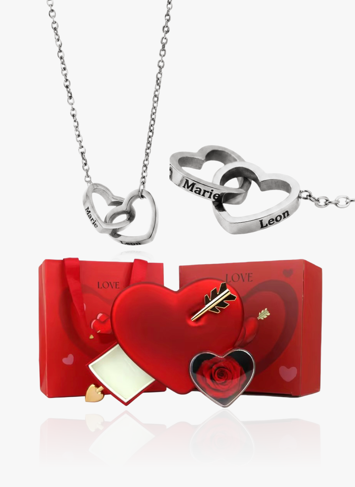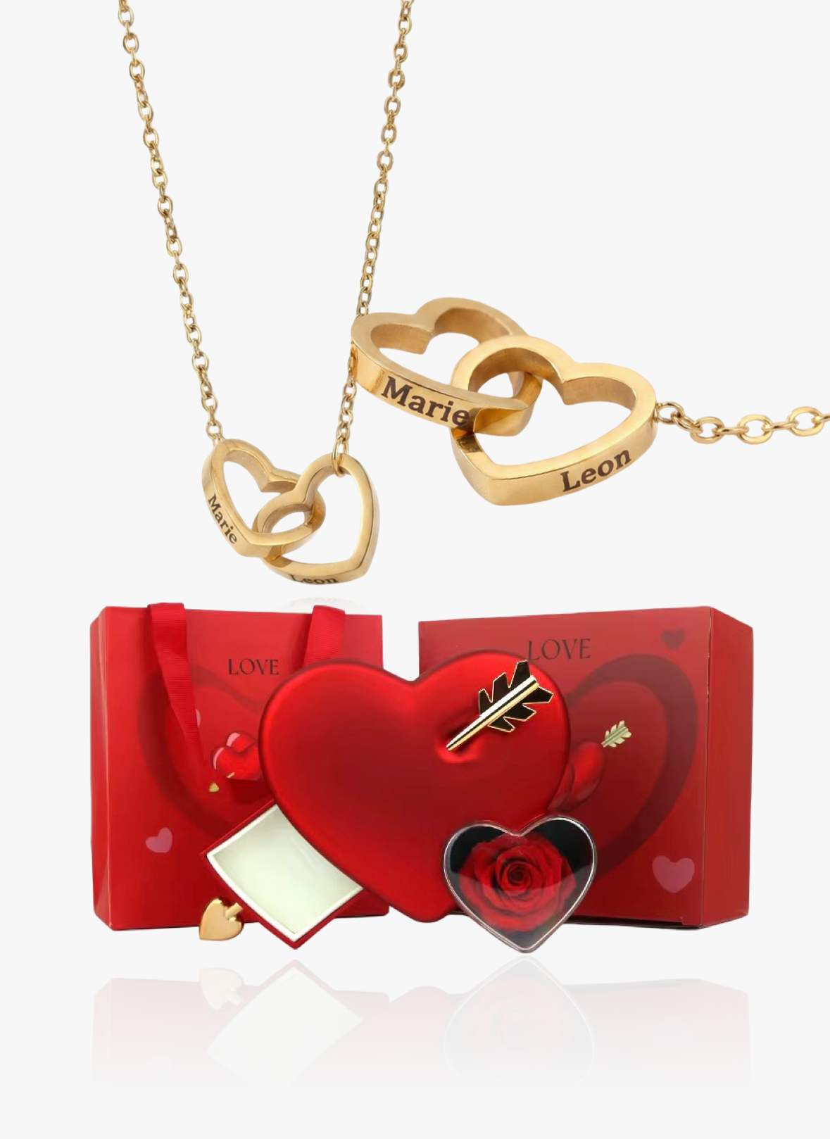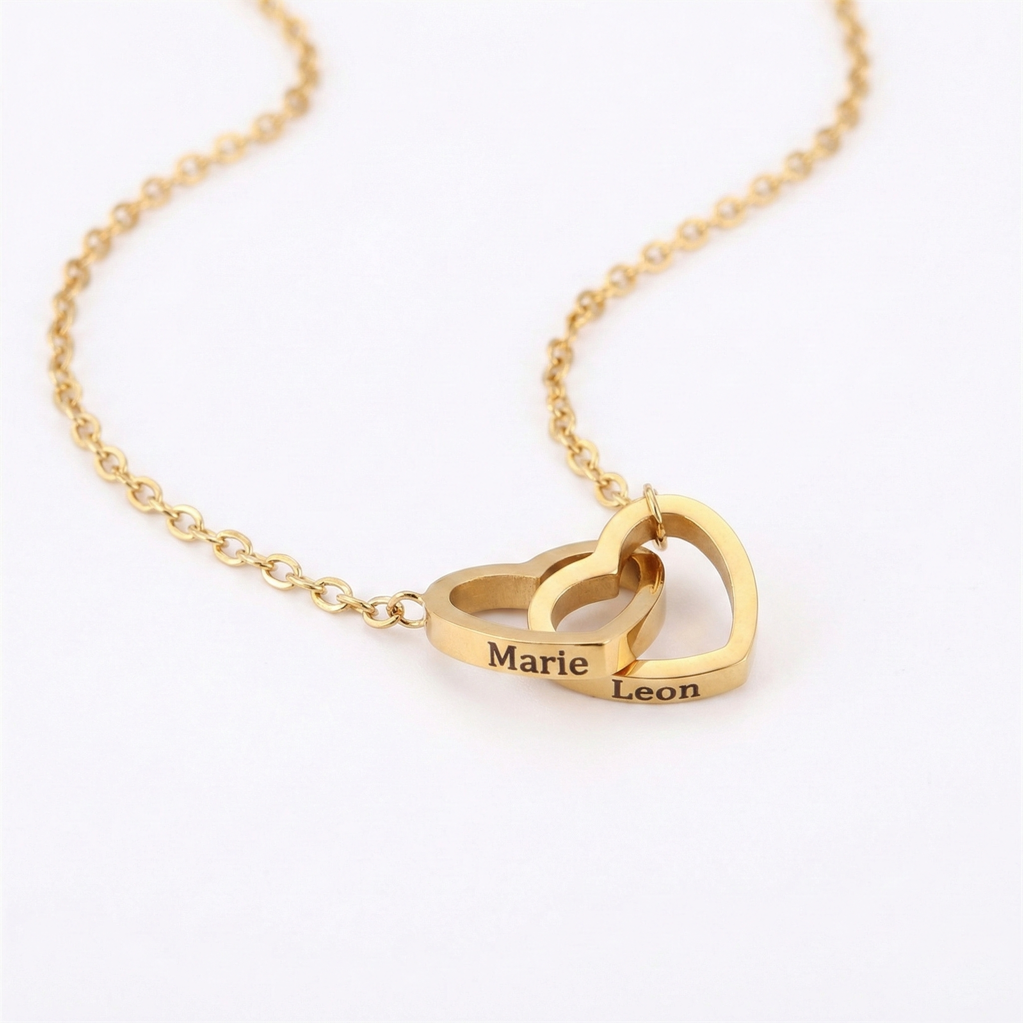 Each linked hearts necklace is truly unique, personal and made by hand from water-friendly high quality materials. Make this your signature everyday necklace or give it as an unforgettable Valentine’s Day or anniversary gift for your girlfriend or wife. Add your name and the name of your loved one, to be engraved on the hearts forever. This delicate item is perfect for layering and adds a signature element to any of the outfits.